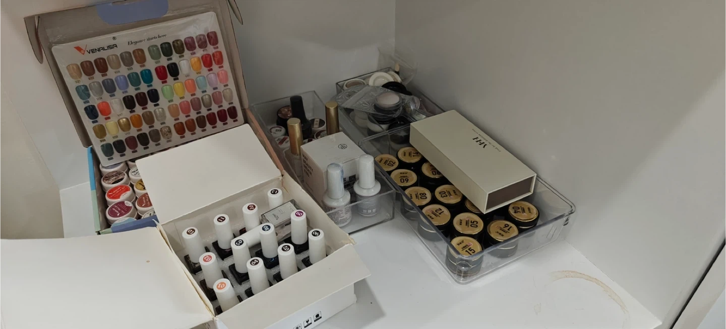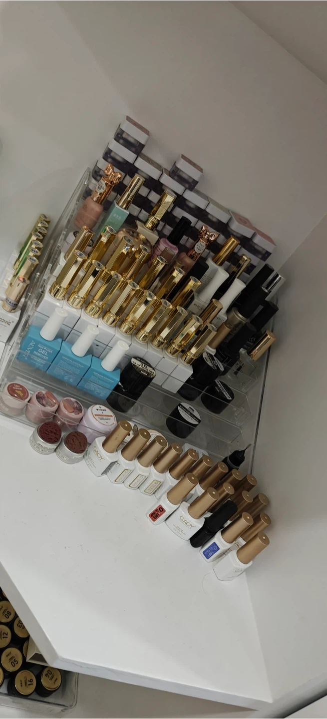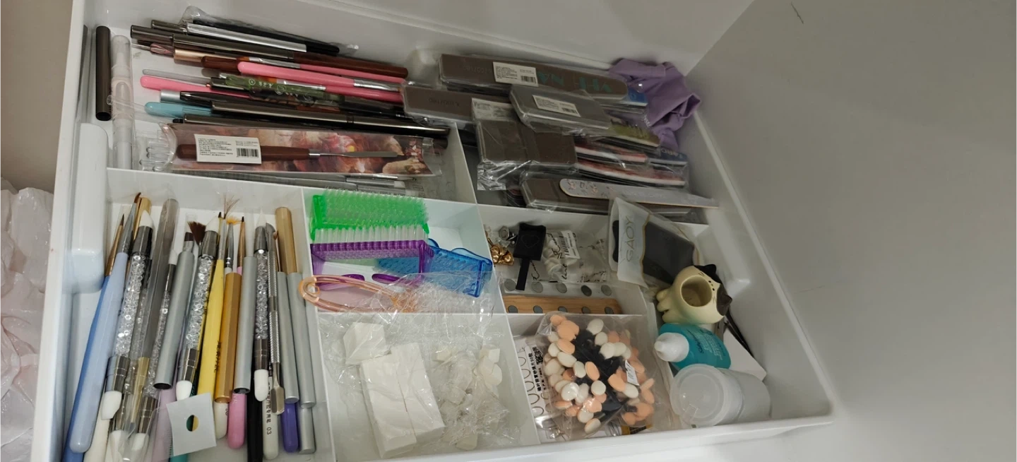 A comprehensive set of nail art supplies including polishes, brushes, files, and drill bits. It also includes a professional electric nail drill machine with various attachments. All items are organized for convenient use.
