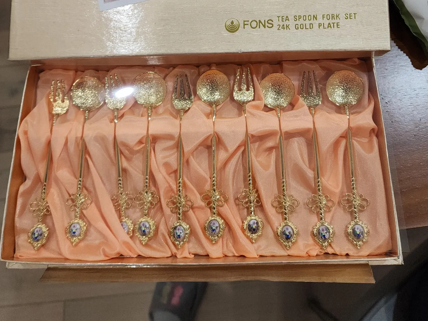 This Fons tea spoon and fork set is 24K gold plated. It includes spoons and forks with decorative handles. The set comes in a presentation box.