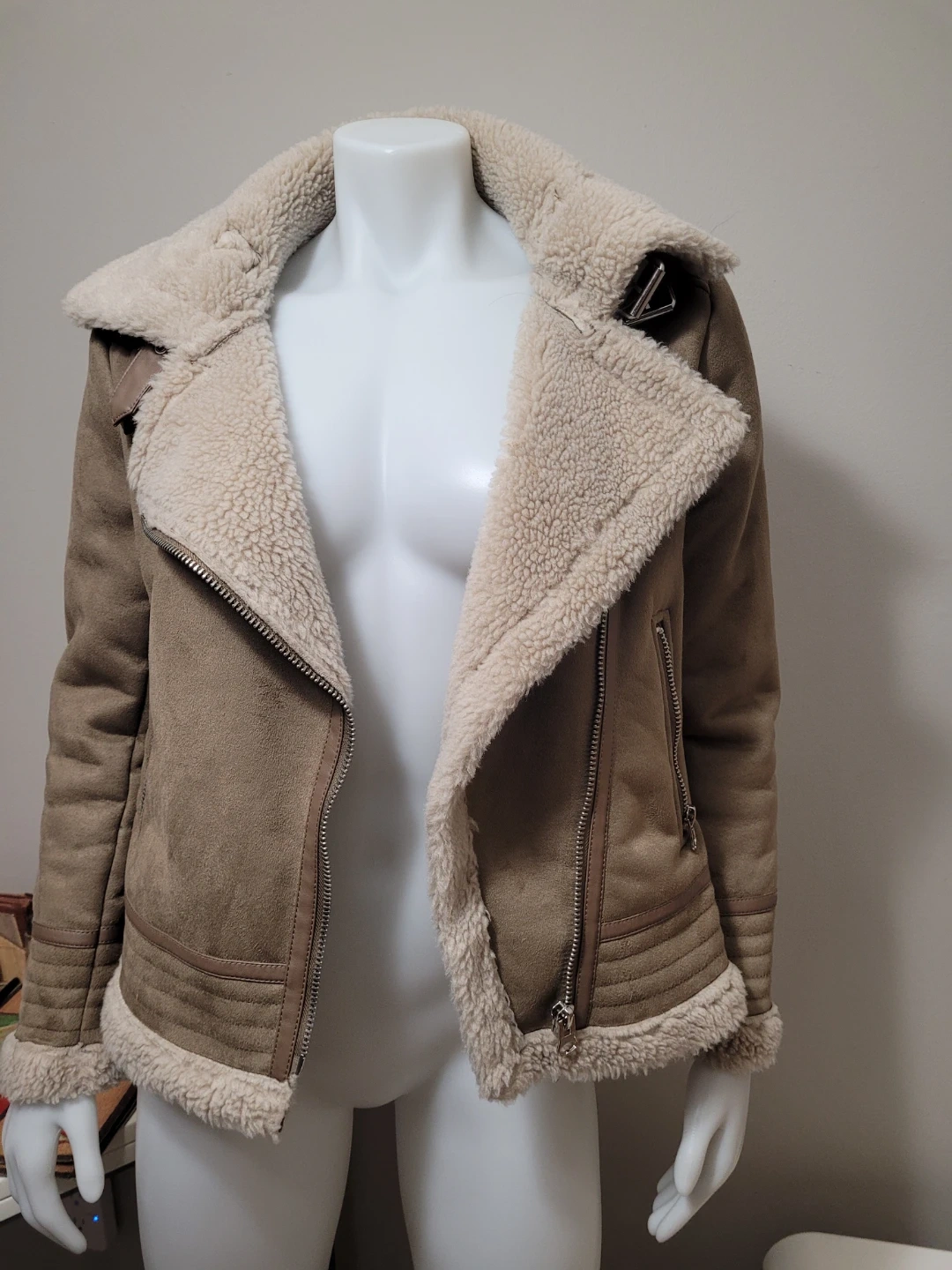This stylish tan moto jacket features a soft faux suede exterior with cozy shearling lining. It has an asymmetrical zip closure and two zippered pockets. It's a great layering piece for cooler weather!