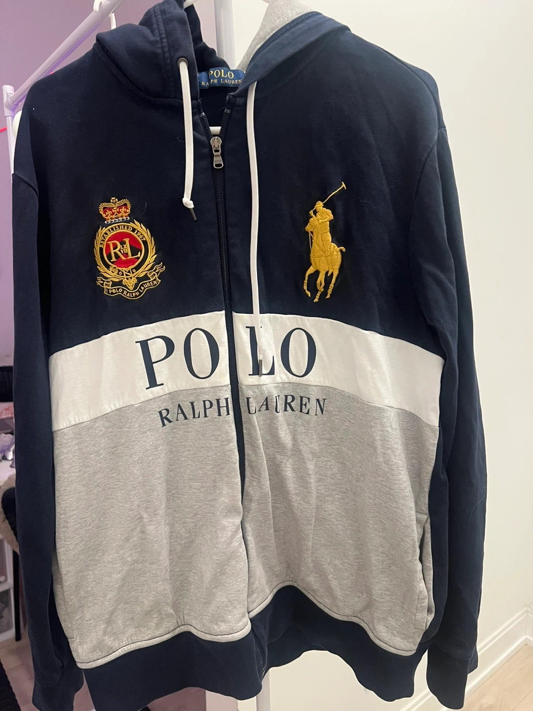 Selling a Polo Ralph Lauren full zip hoodie! It's a size large and features a classic design with the Polo logo. The hoodie is in great condition and perfect for layering or wearing on its own. A great addition to any wardrobe!