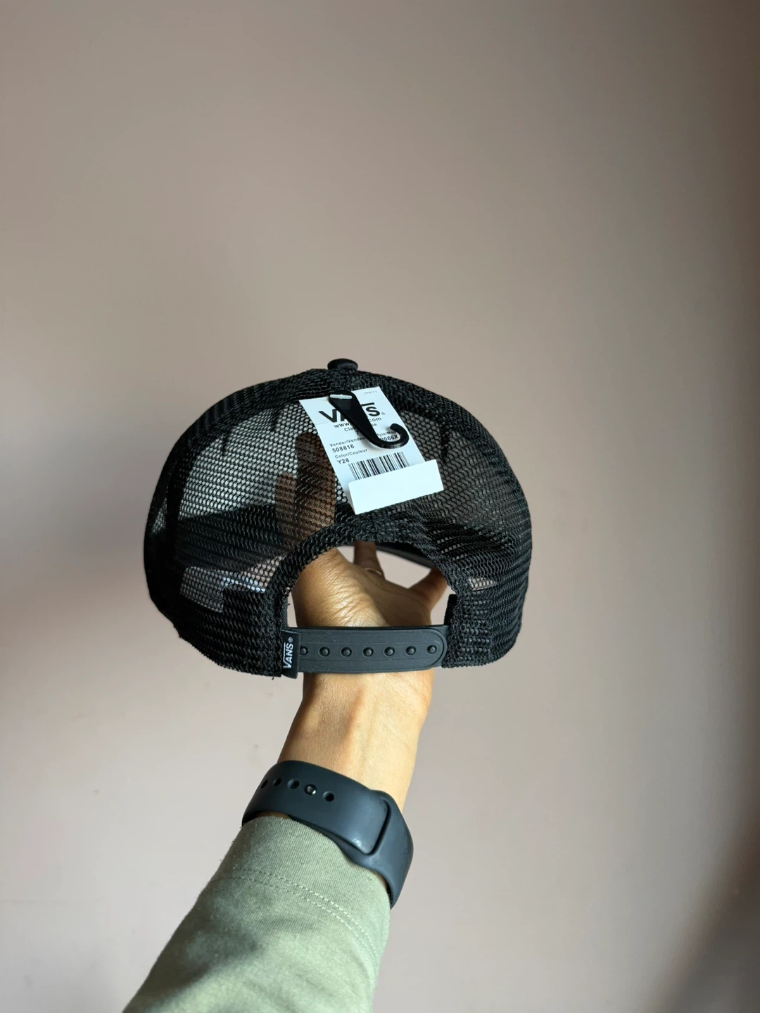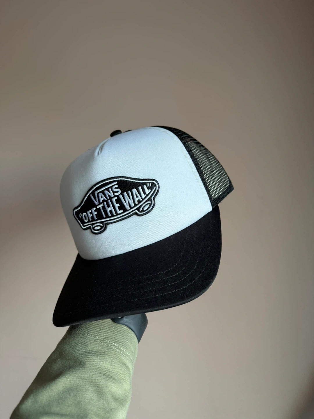 This is a Vans trucker hat. It's black and white with a mesh back. The iconic Vans 'Off The Wall' logo is featured on the front.