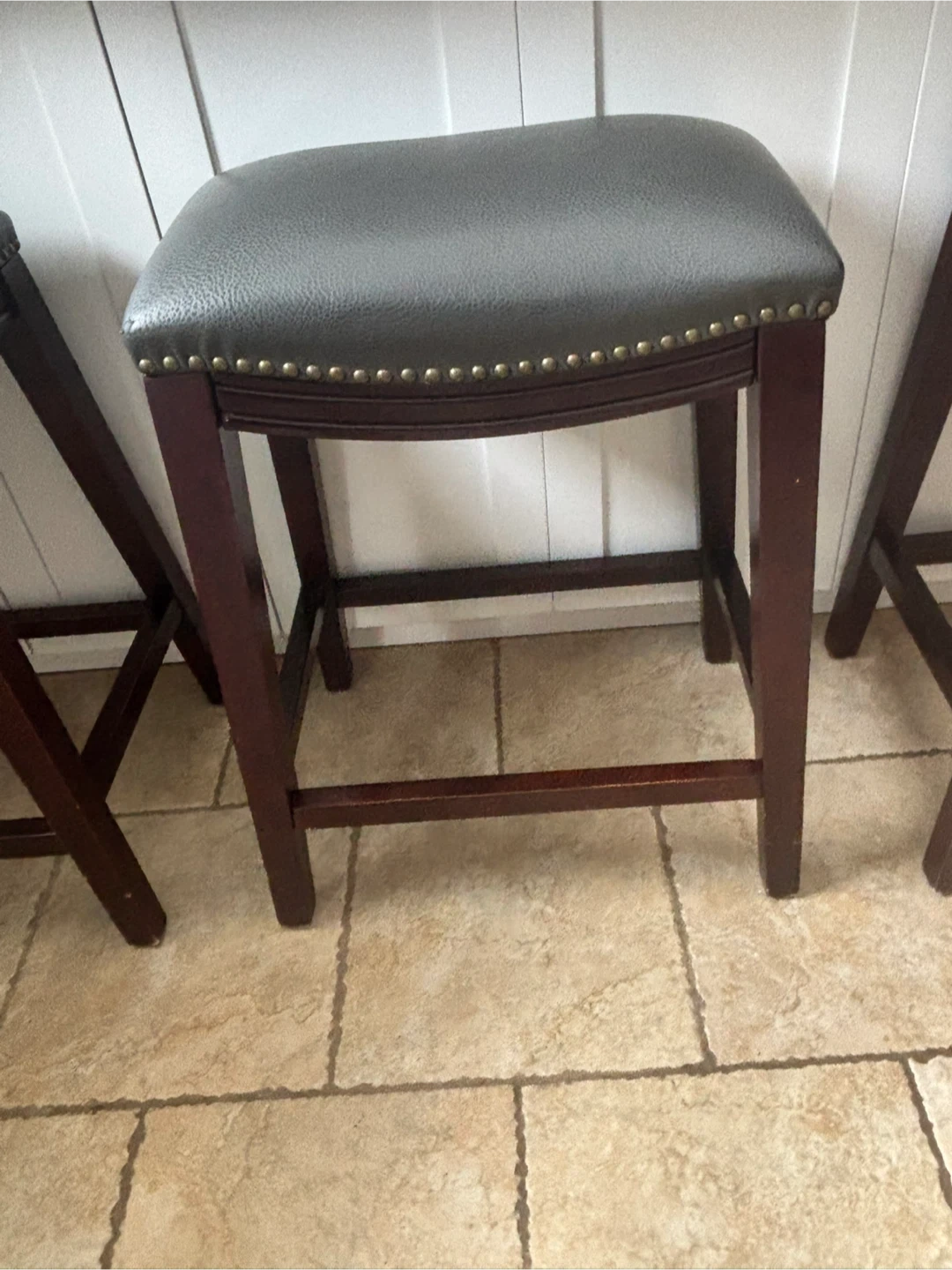 Beautiful set of 4 solid wood counter-height stools in great condition. Dark espresso finish with grey upholstered seats and nailhead trim detail.