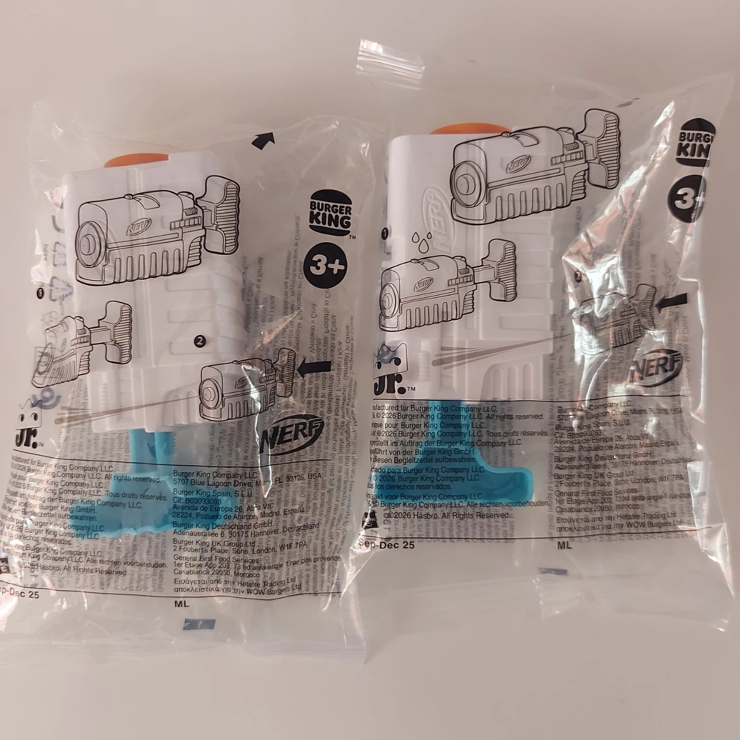 Two new Burger King Jr. Nerf water blasters are included! These toys are suitable for ages 3 and up. They were manufactured to be sold between September and December of 2025.
