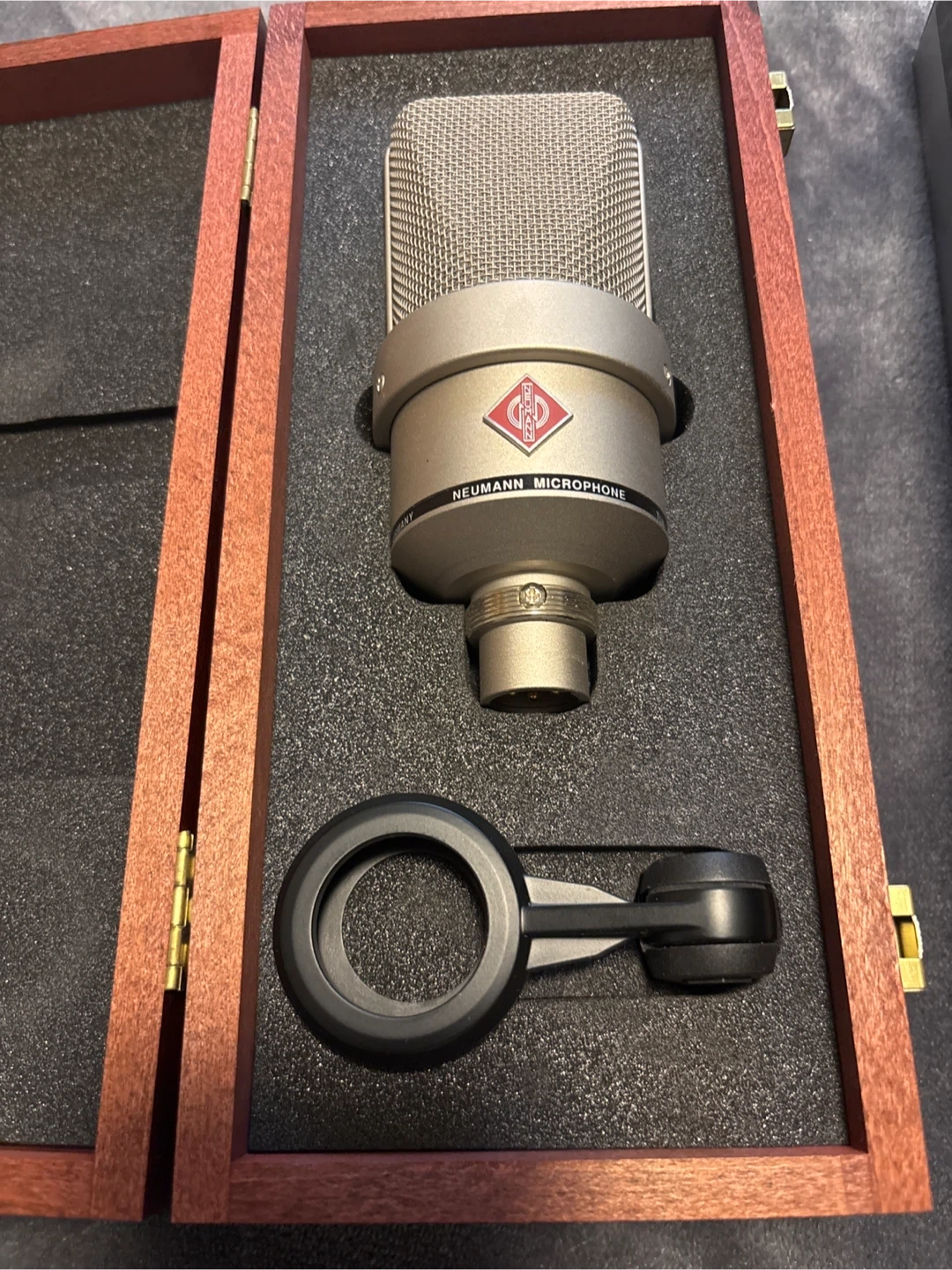 This is a Neumann TLM 103 condenser microphone. It's designed for studio use and comes with its original wooden case and shock mount. Includes the original box too!