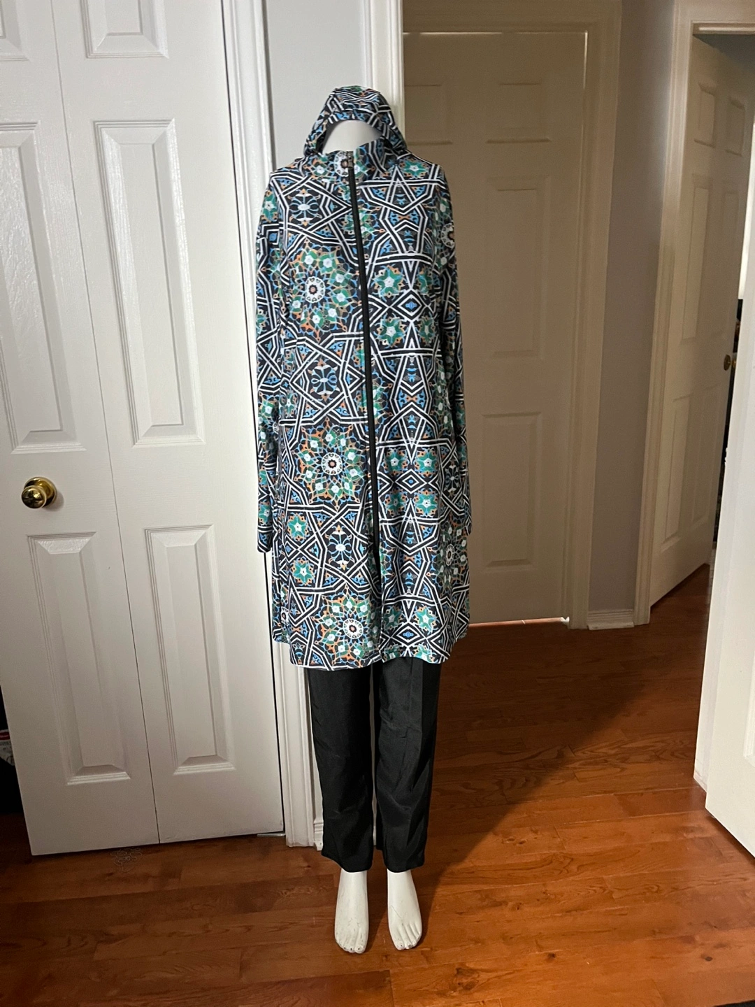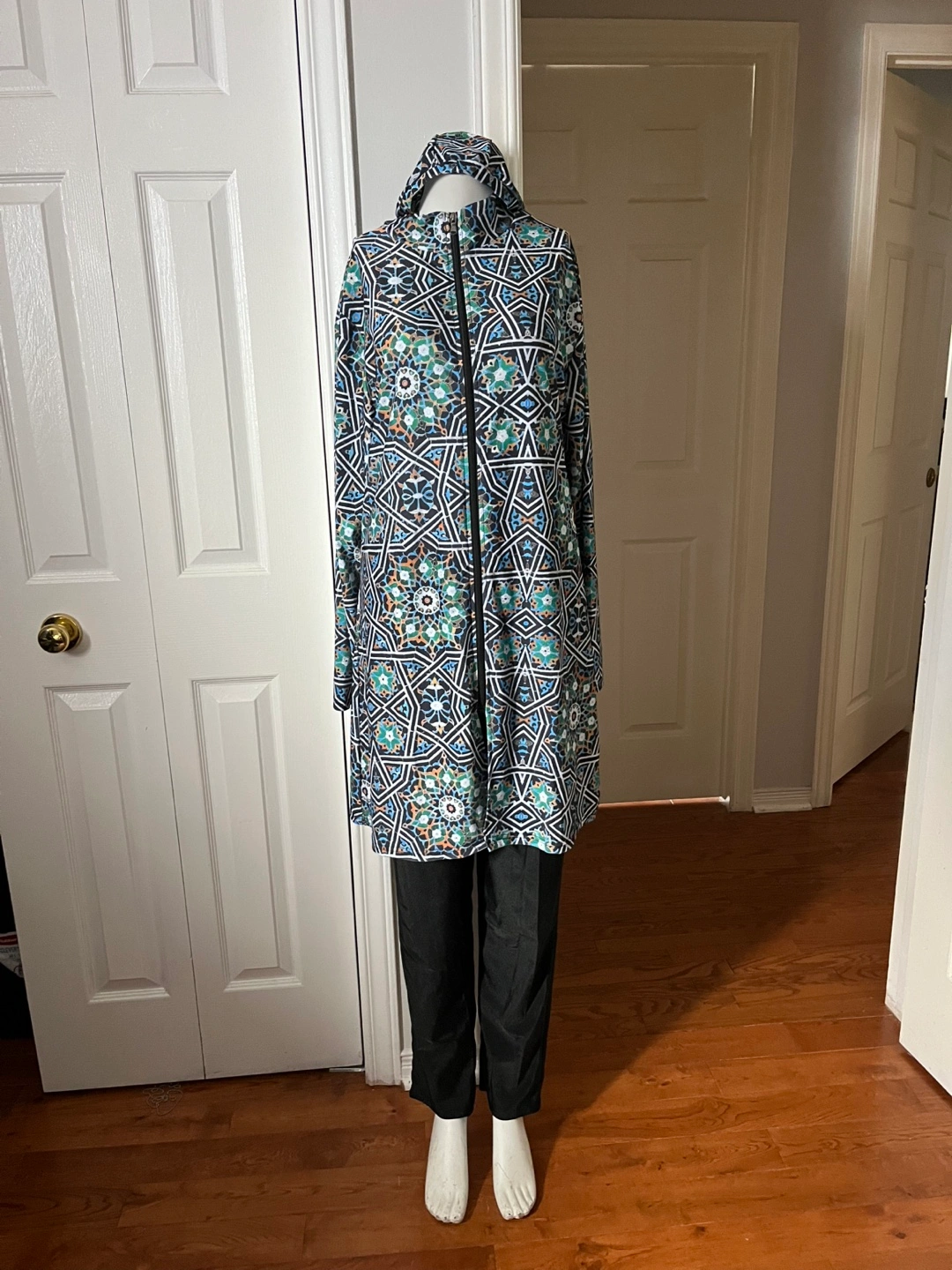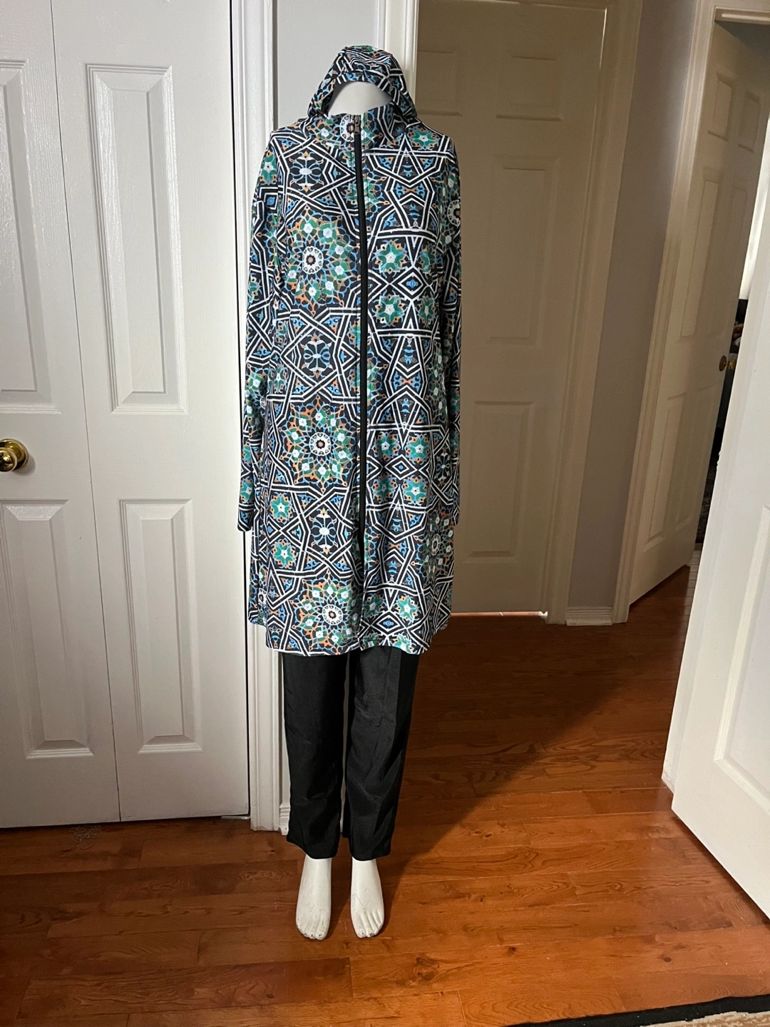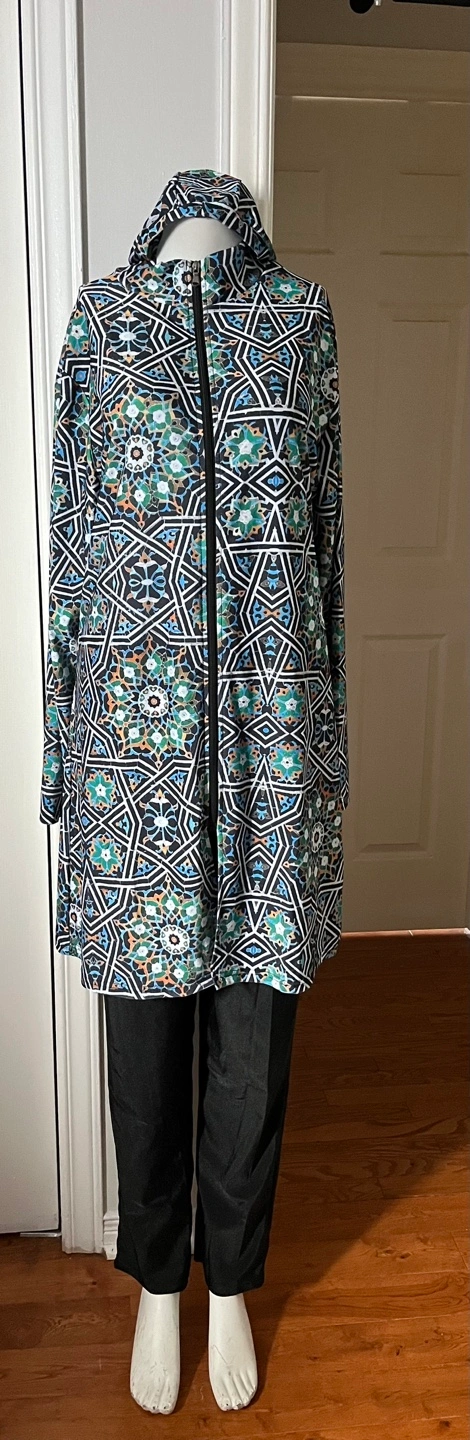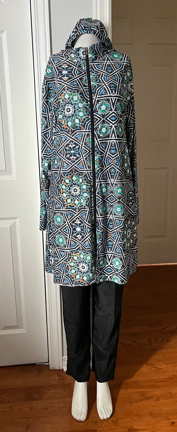 A modest swimwear set featuring a long-sleeved tunic with a full-zip front ,a geometric pattern.and a hat. It's paired with matching black pants. This set offers full coverage for water activities.