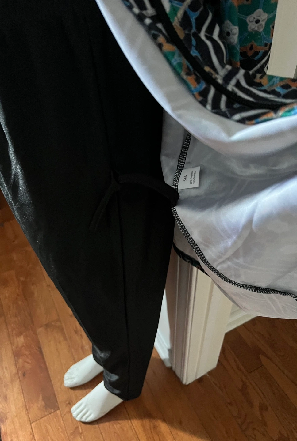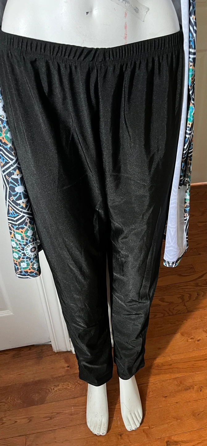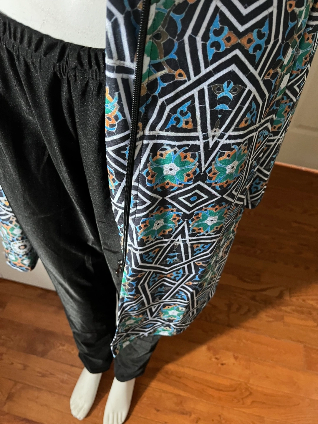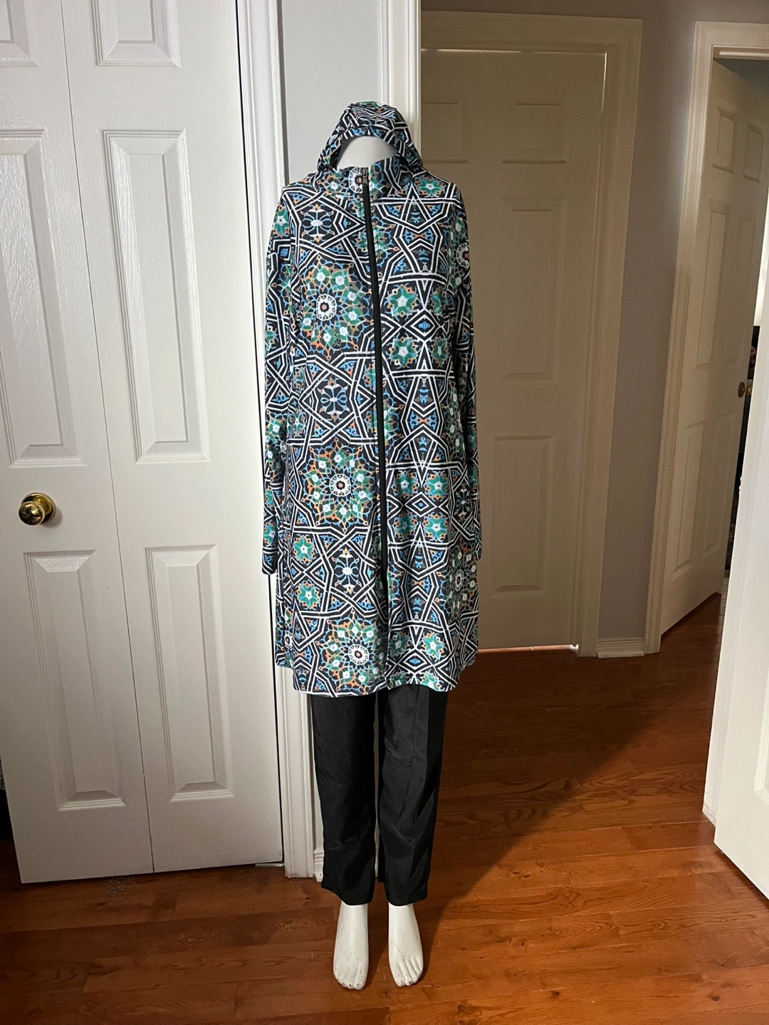 A modest swimwear set featuring a long-sleeved tunic with a full-zip front ,a geometric pattern.and a hat. It's paired with matching black pants. This set offers full coverage for water activities.