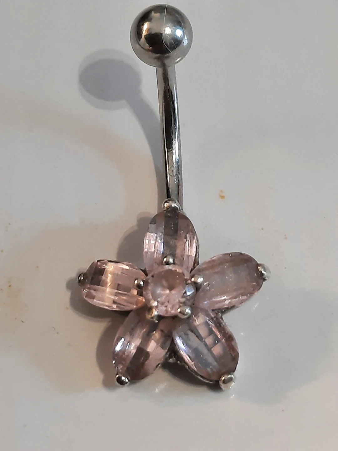 This belly button ring features a delicate flower design adorned with sparkling pink gems 925 sterling silver stamped 925.. It's made from silver-toned metal, ensuring a bright and shiny appearance. This piece adds a touch of charm to your navel piercing. Perfect for everyday wear or special occasions!
