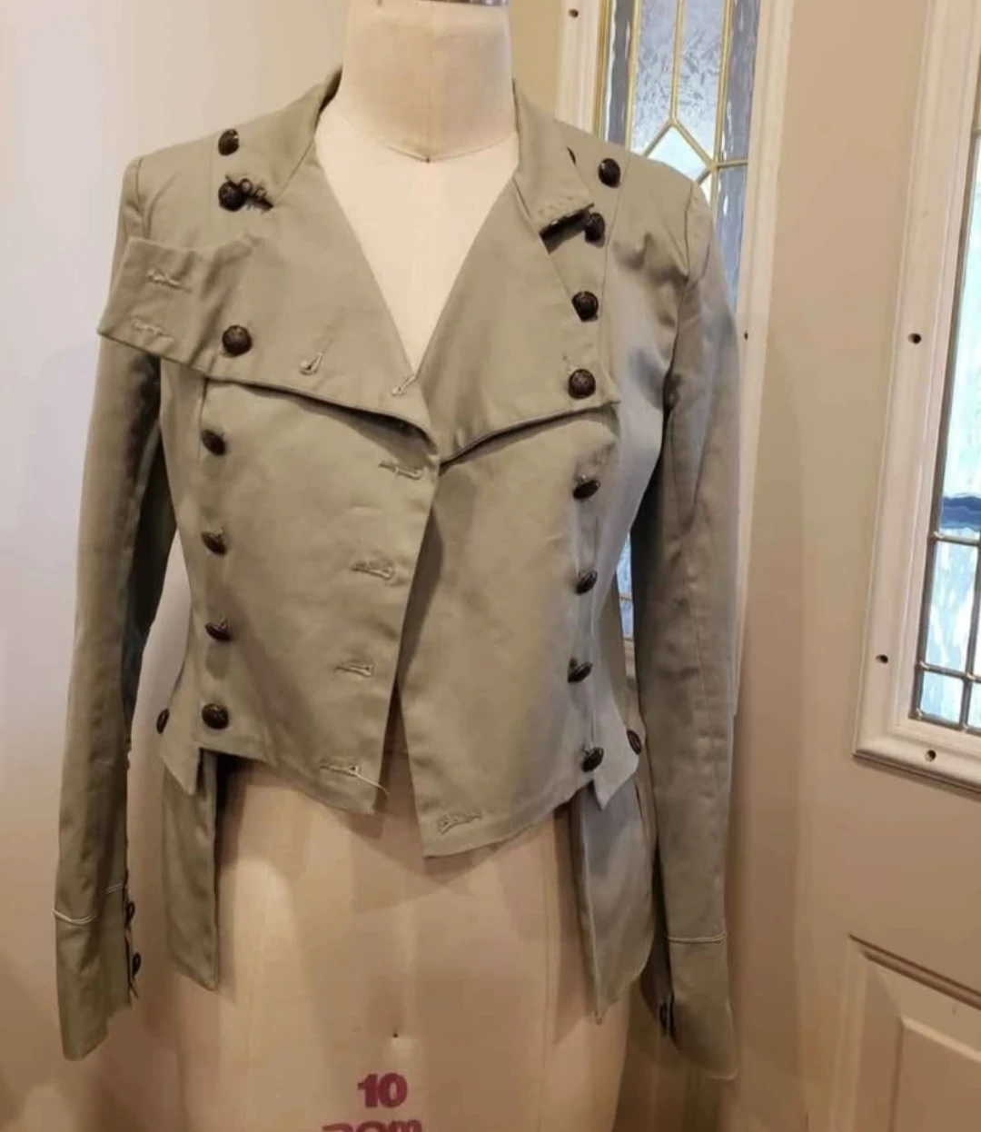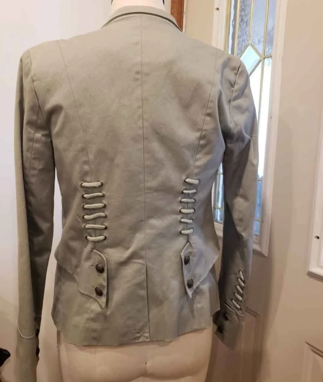 This Urban Behavior jacket is a size medium. It features a stylish double-breasted front with decorative buttons. The back has unique lacing details. A great statement piece for any wardrobe! Meetup location eglinton and dufferin