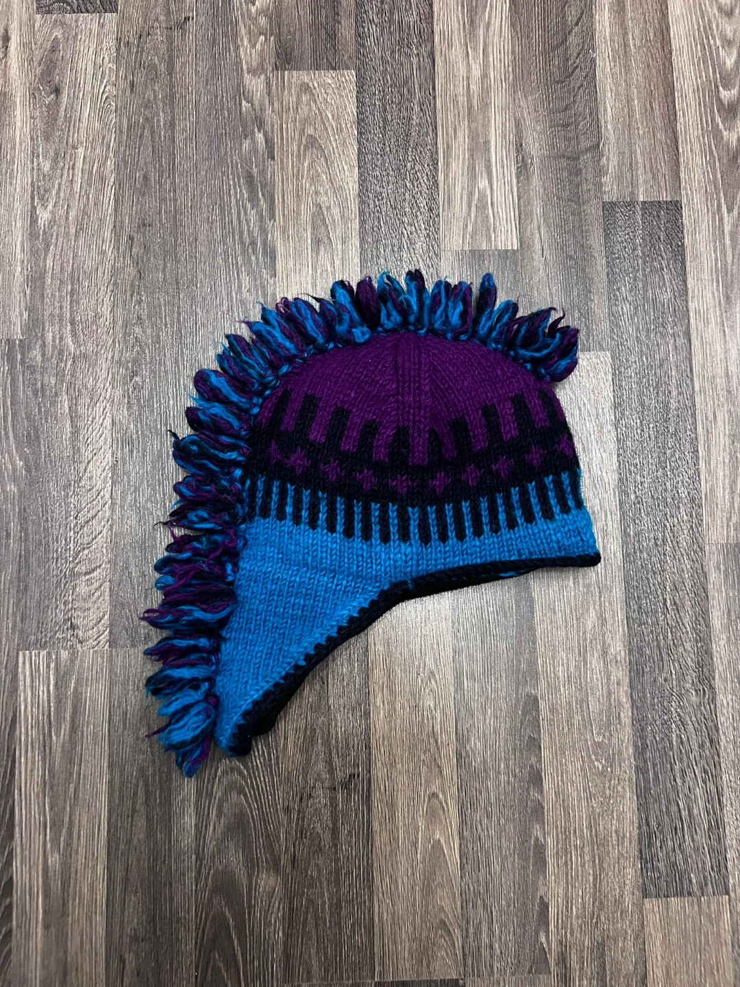 A fun knit hat with a unique mohawk design. It's made of a soft, stretchy material. Features ear flaps for extra warmth!