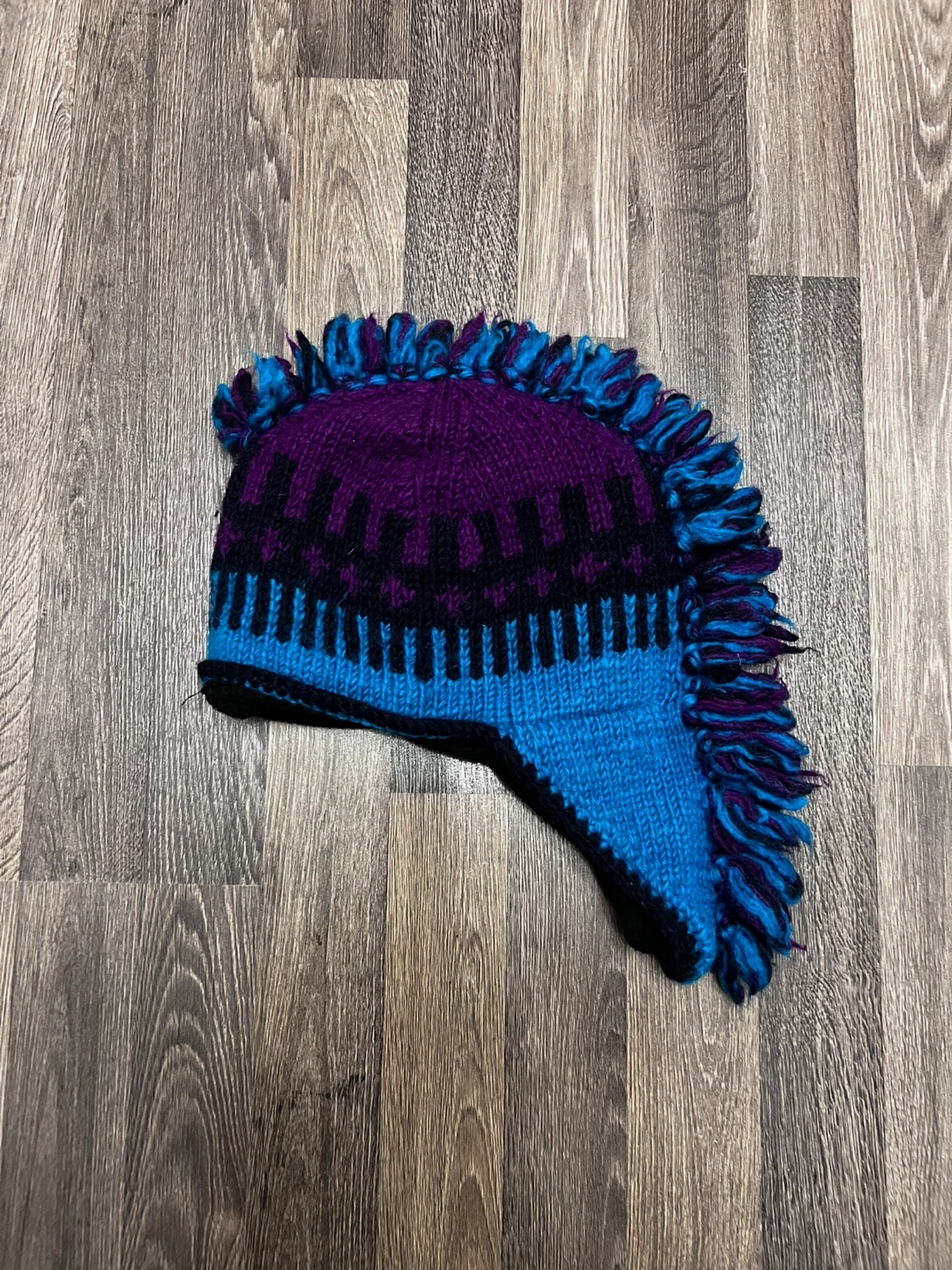 A fun knit hat with a unique mohawk design. It's made of a soft, stretchy material. Features ear flaps for extra warmth!