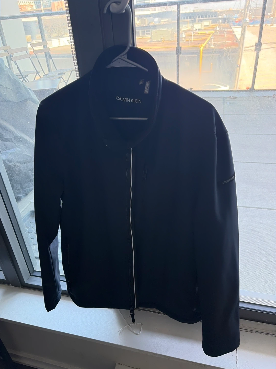Calvin Klein men's black softshell jacket. It's a full zip style with a white accent zipper. Features a chest pocket and adjustable hem. Great for layering!