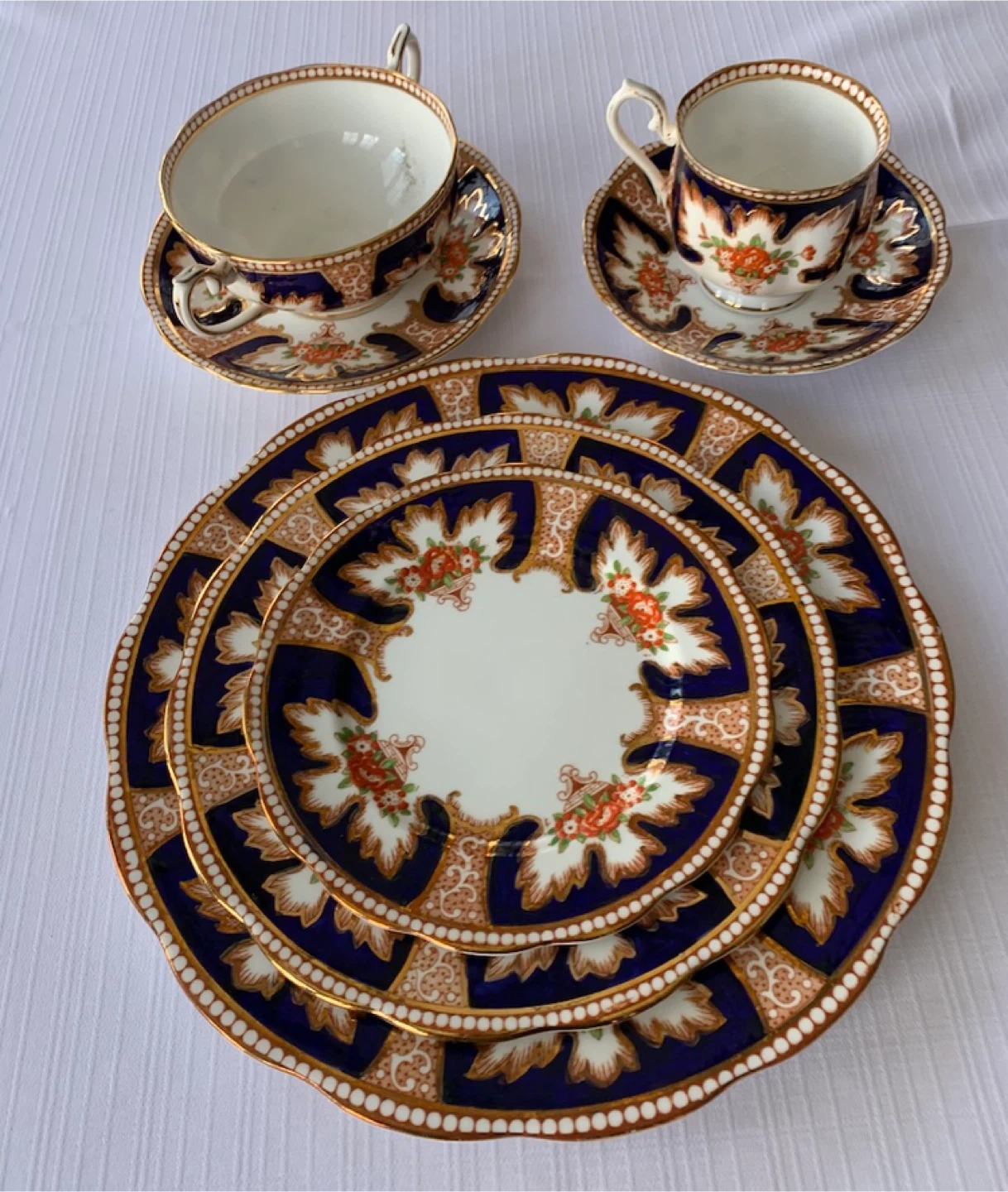 Set includes cups and saucers, soup bowls, and two side plates and dinner plate. in the classic Royalty pattern. Each piece features a navy blue border with intricate gold detailing and floral design. Great condition no cracks or chips despite 60 years service. Estimated worth $1500- 2500.