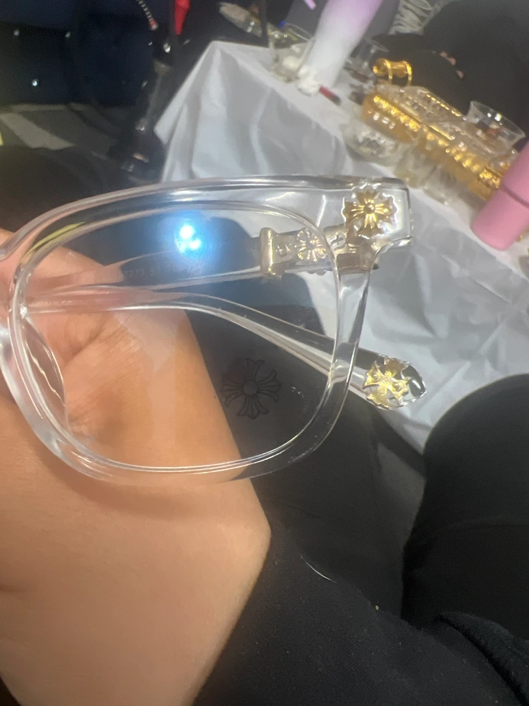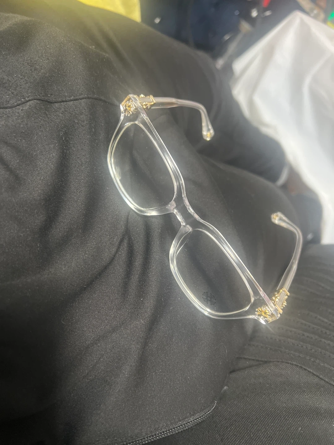 These are Chrome Hearts glasses with a clear frame. They feature gold-toned no box