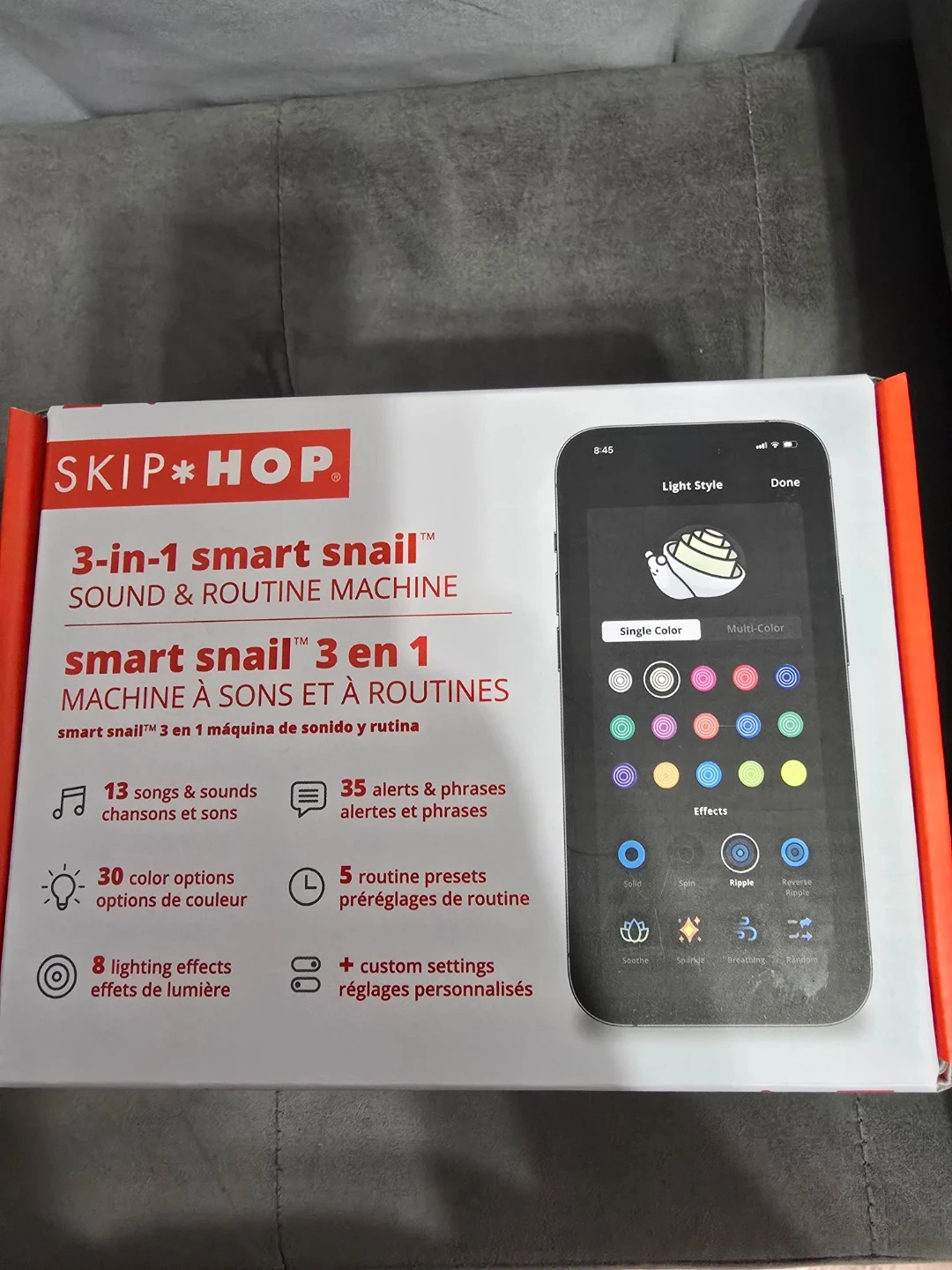 Selling a Skip Hop 3-in-1 Smart Snail Sound & Routine Machine! It functions as a sound machine, nightlight, and routine system. It has: