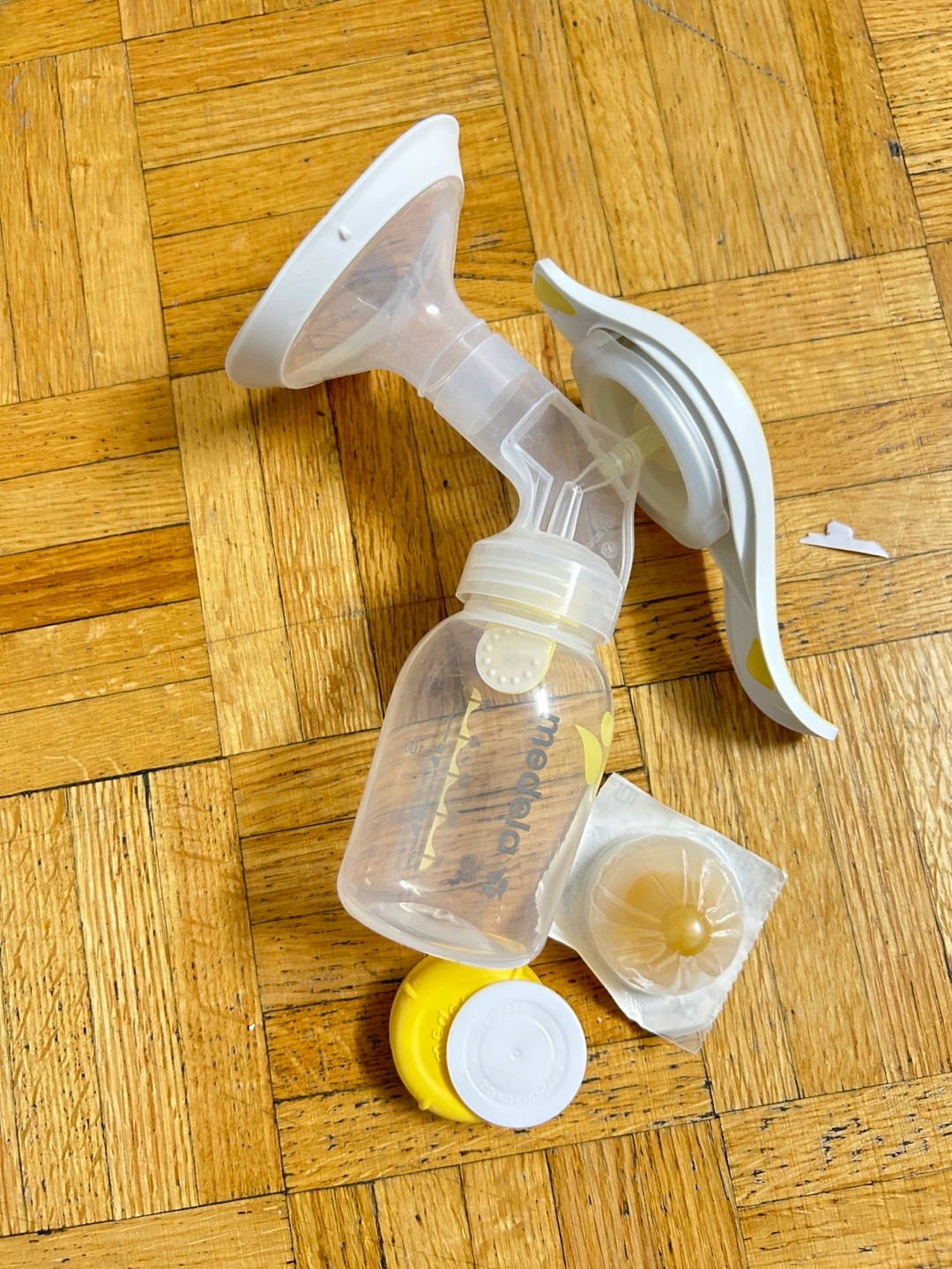 Selling a Medela breast pump. It comes with the parts you see in the picture, including the bottle, breast shield, and valve. Perfect for new parents!