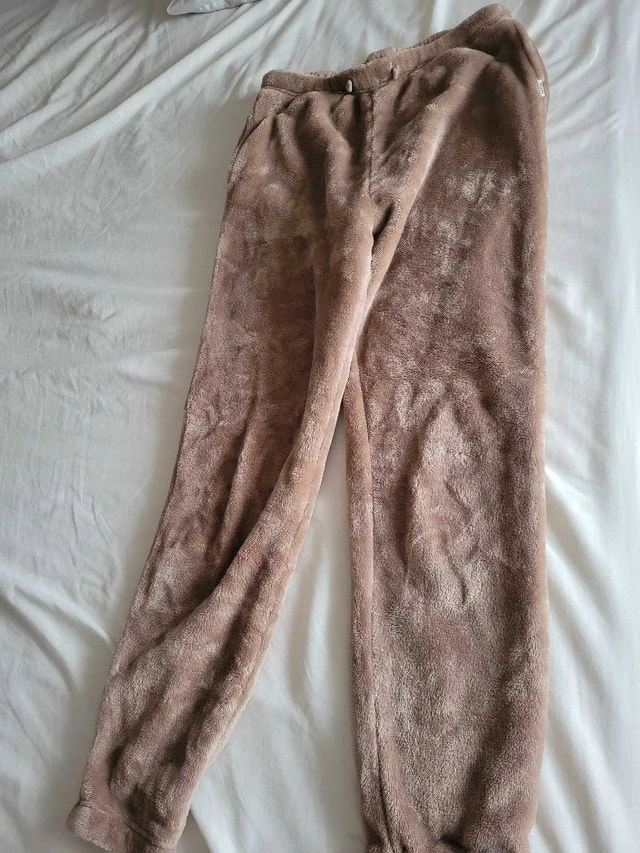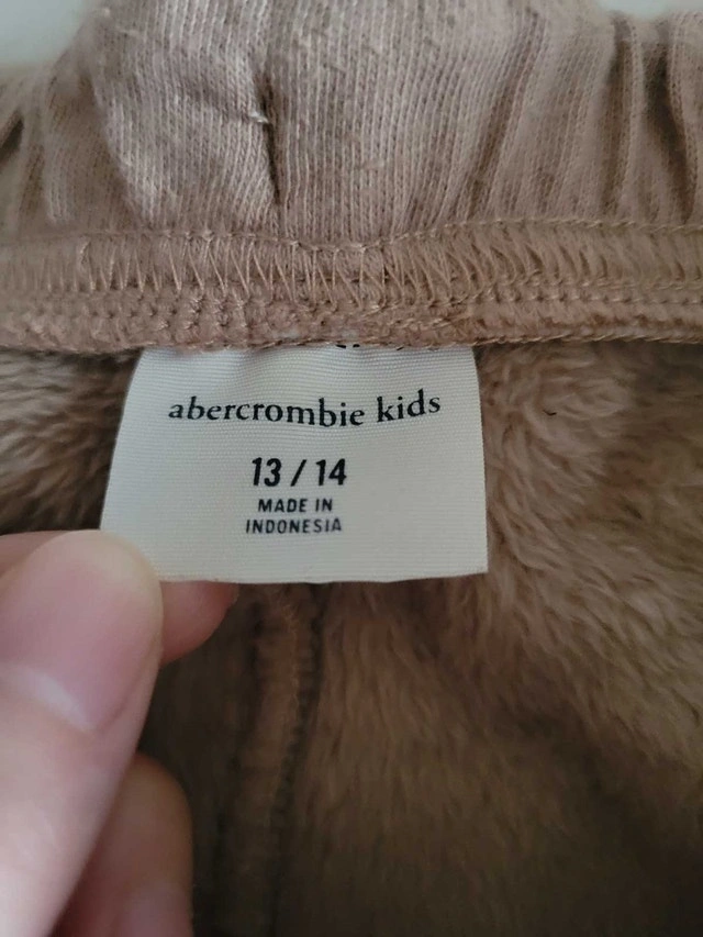 Abercrombie Kids girls beige plush pants, size 13/14. These cozy pants are perfect for lounging or casual wear, offering both comfort and style. Brand: Abercrombie Kids, Size: 13/14, Colour: Beige, Material: Plush fabric. If the ad's up, they're available!