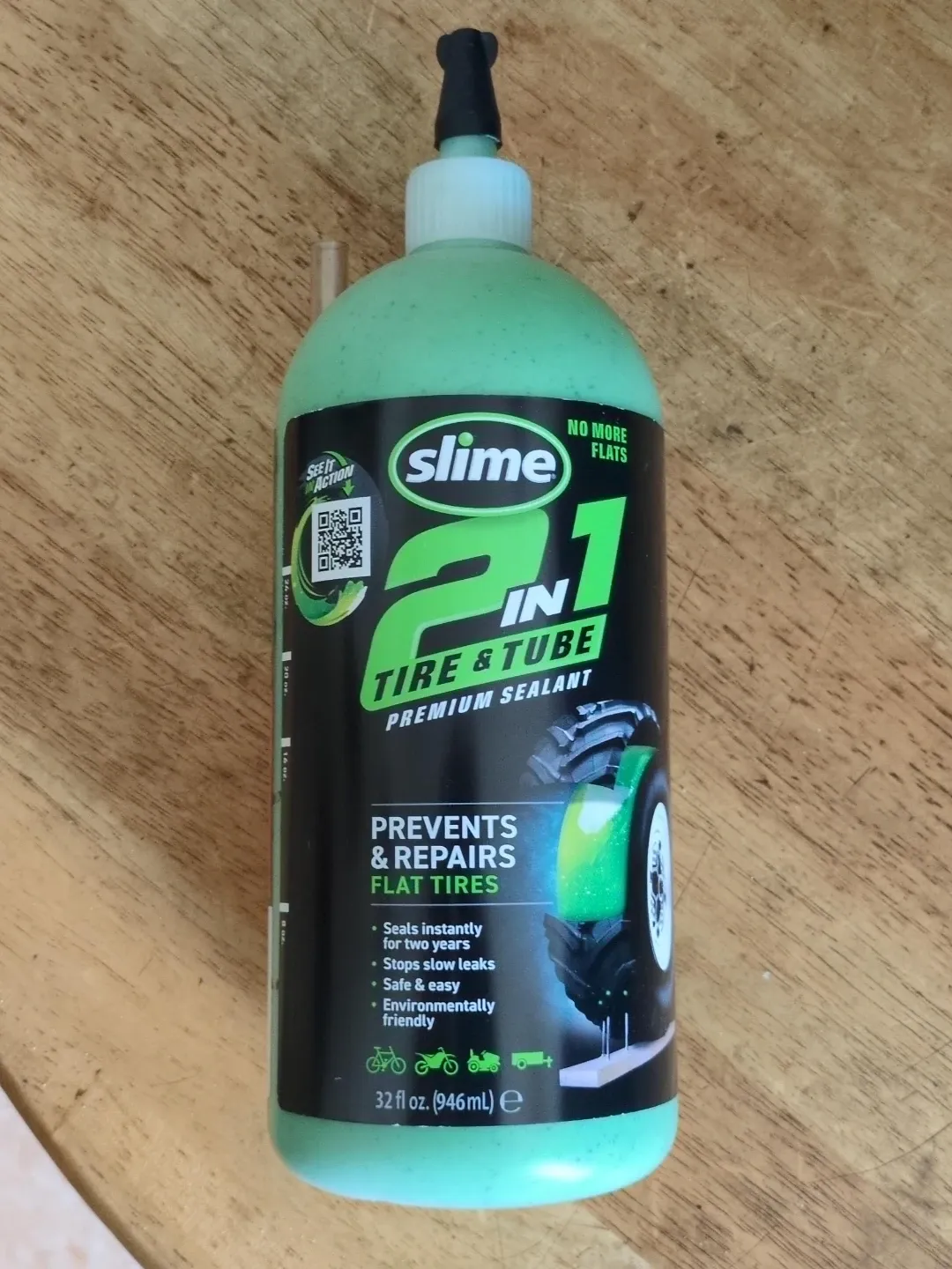 This is Slime 2-in-1 Tire & Tube Premium Sealant. It prevents and repairs flat tires. Seals instantly for two years and stops slow leaks. Safe, easy, and environmentally friendly. 24oz remaining in 32 oz bottle.