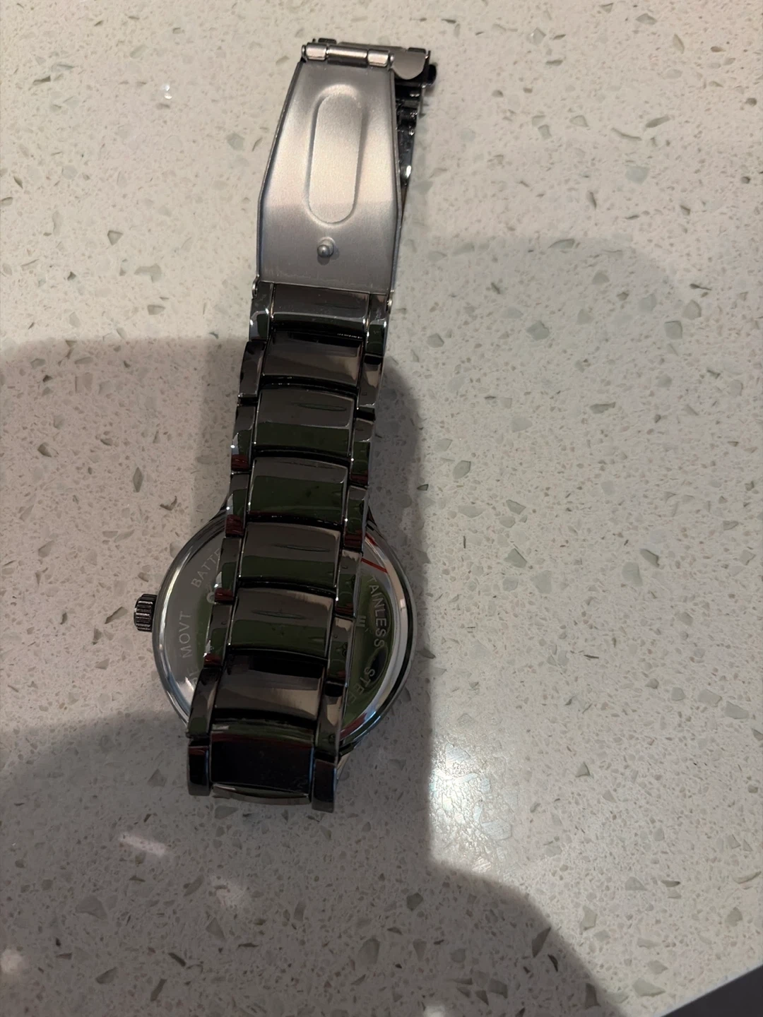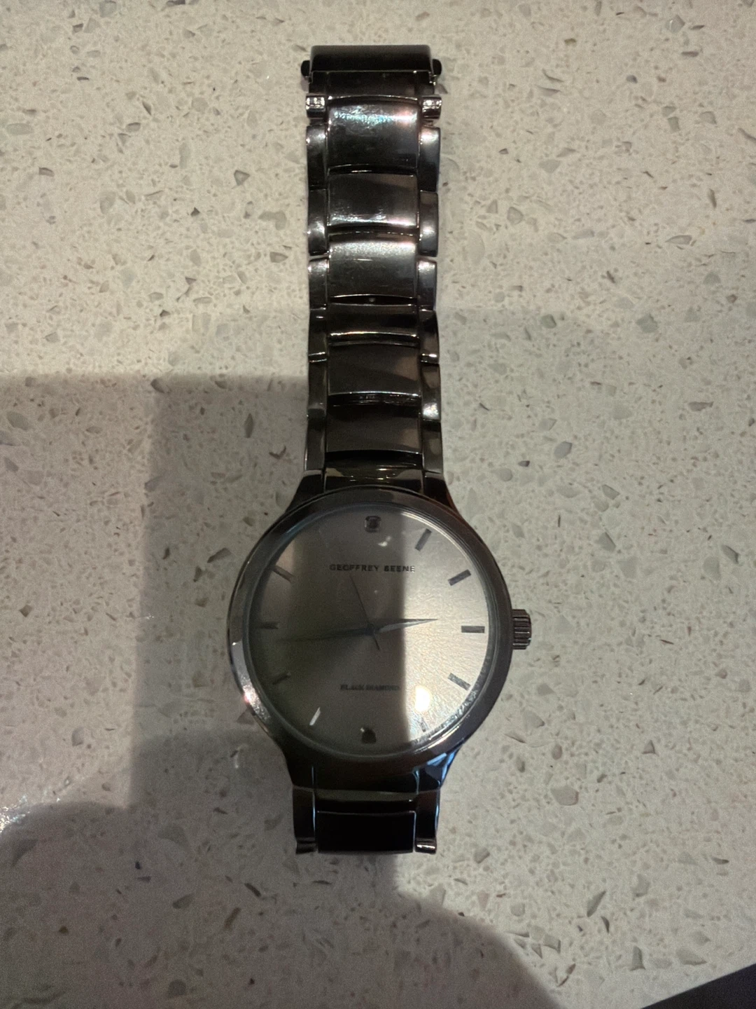 This is a Geoffrey Beene men's watch. It's a "Black Diamond" model. The watch is made of stainless steel and has a metallic finish.