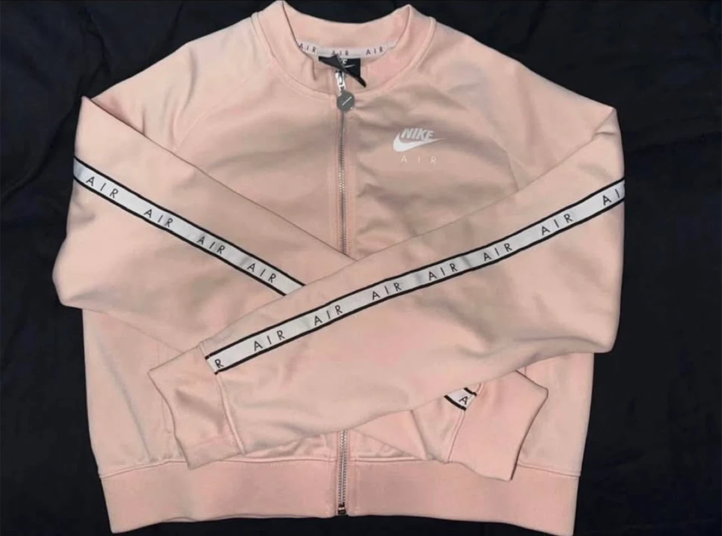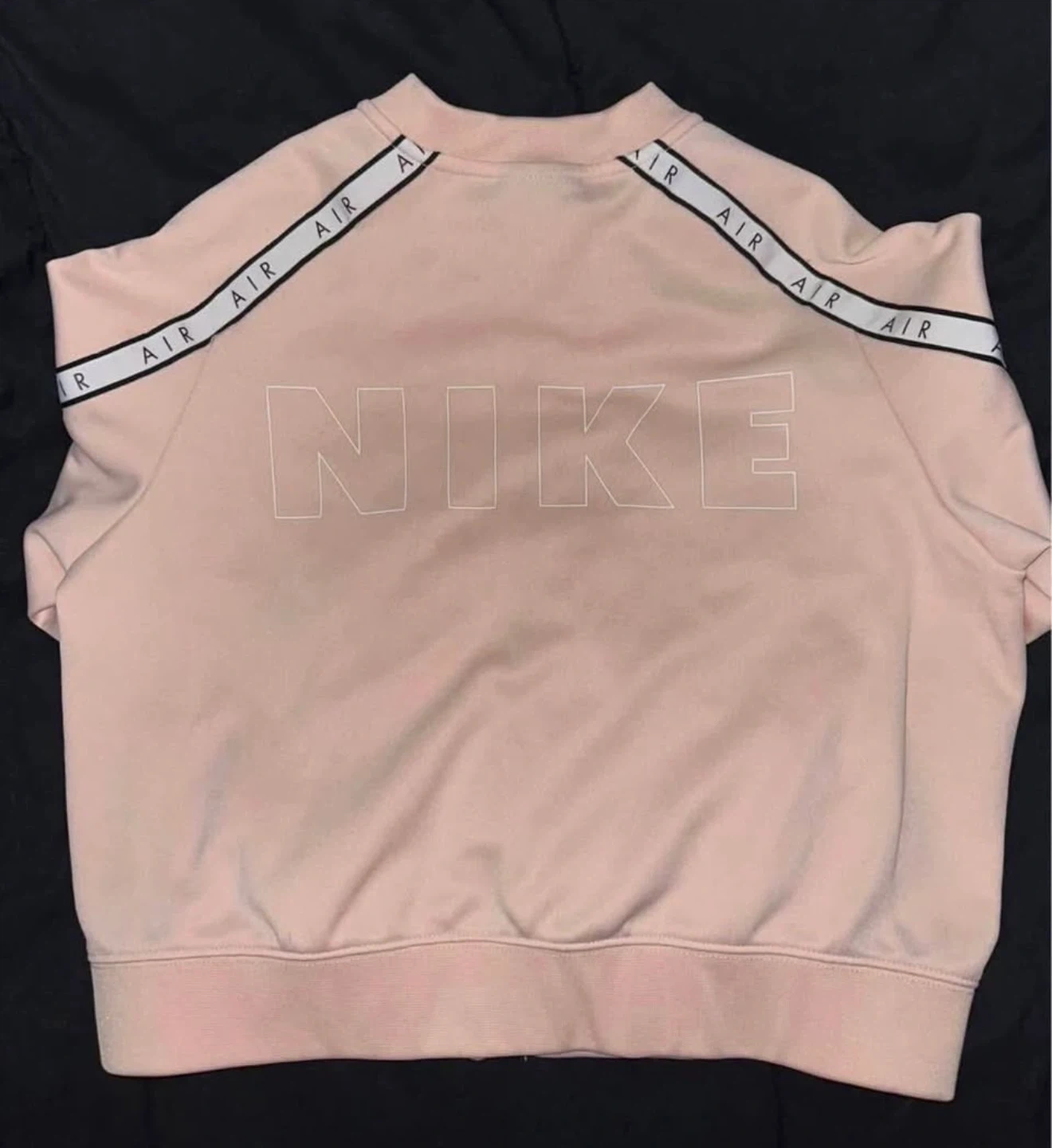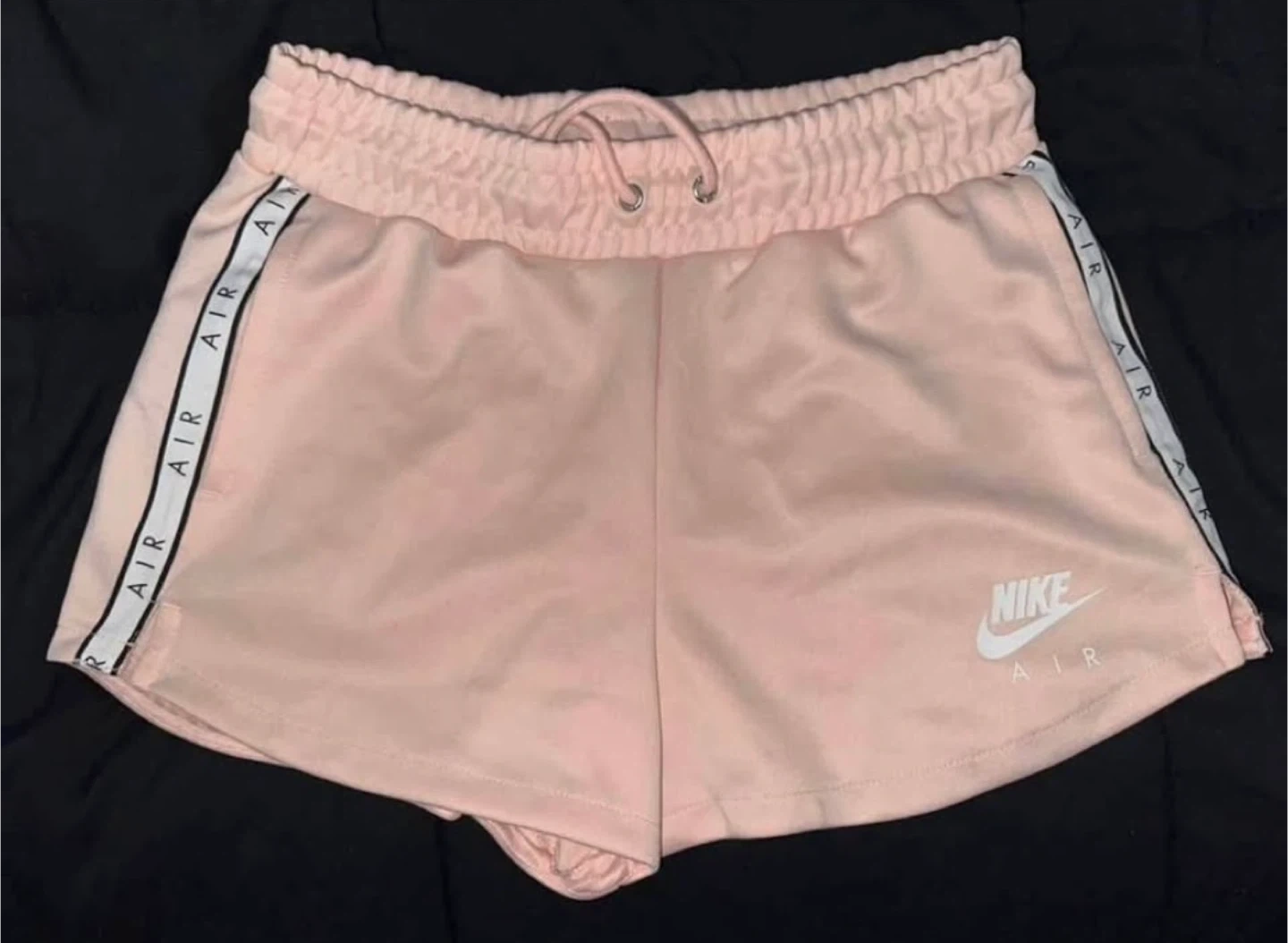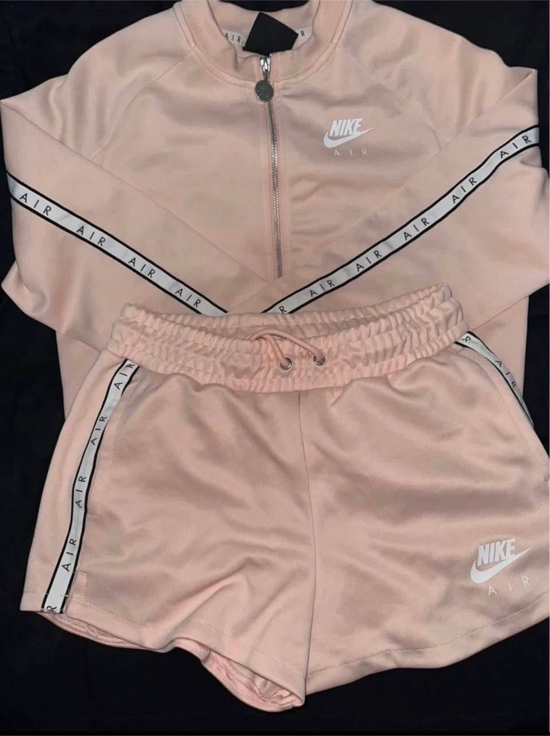 This is a two-piece Nike Air tracksuit set in a light pink colour. It includes a zip-up jacket and matching shorts. Both pieces feature the signature 'Air' tape detail along the sleeves and sides. Elastic waistband with drawstring on shorts. This set is great for casual wear or athletic activities!