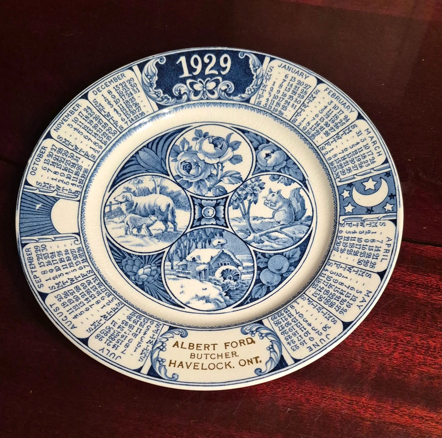 This is a decorative calendar plate from 1929, made by Woods Burslem in England. It features seasonal scenes and a calendar for the entire year. The plate also includes a personalized inscription for Albert Ford, Butcher, Havelock, Ont.