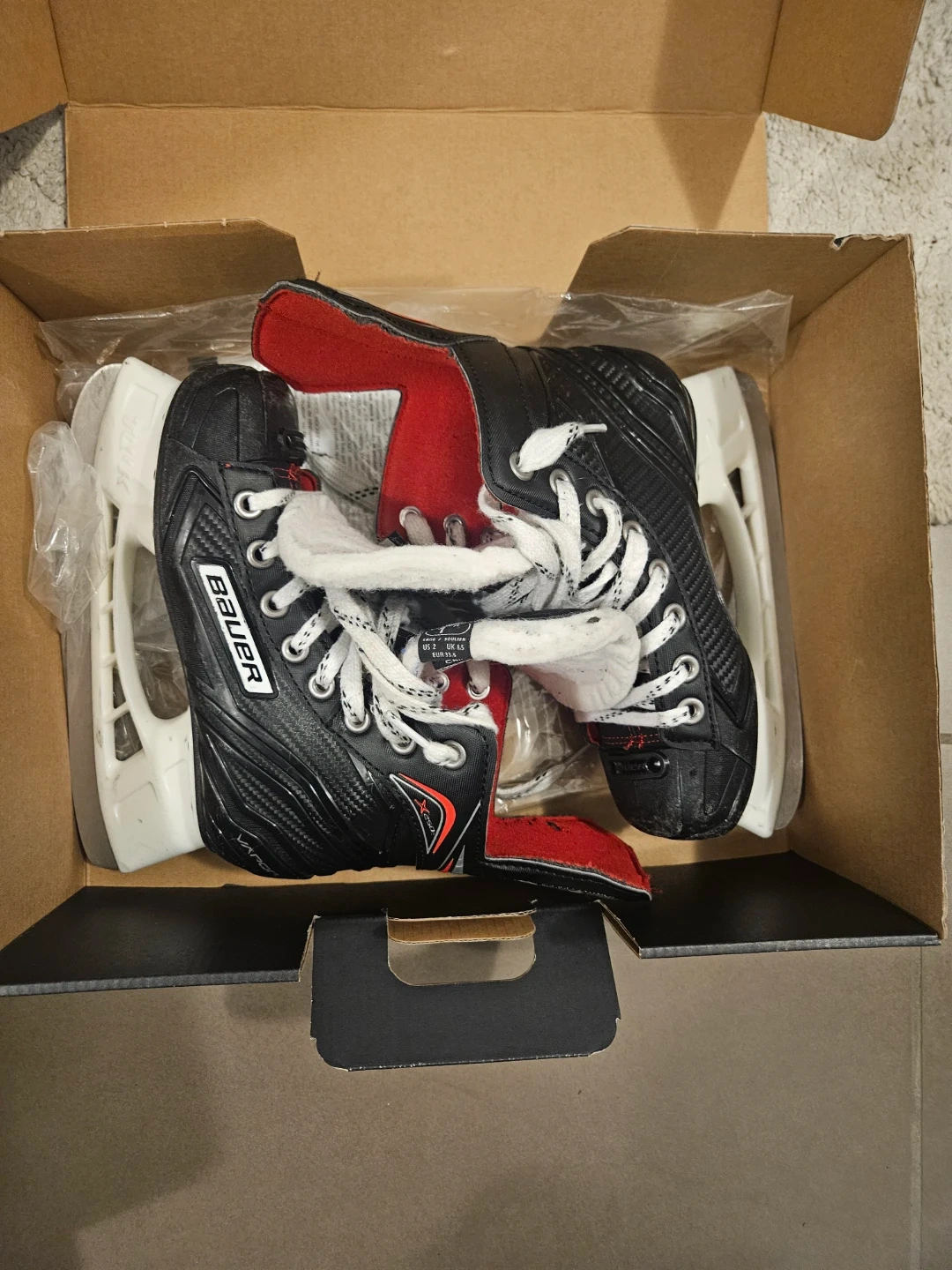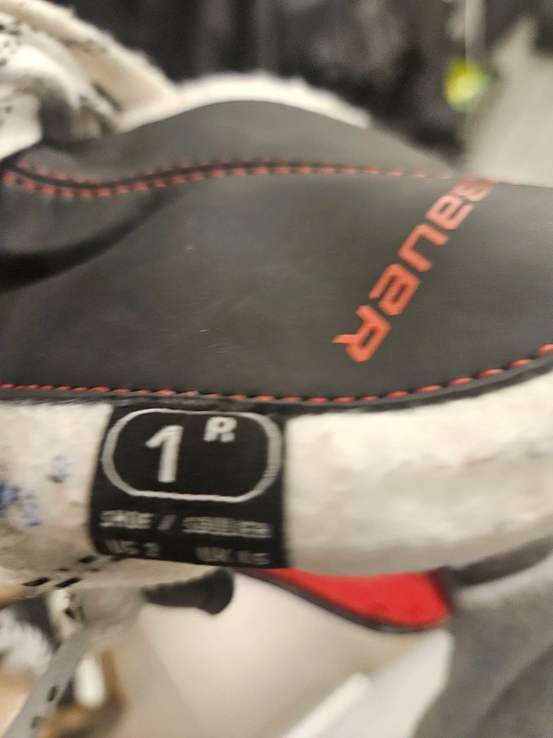 Bauer hockey skates in size 1R. These are US size 2, UK size 1.5, and EUR size 33.5. They're made in China. These skates are suitable for young hockey players just starting out or looking to upgrade.