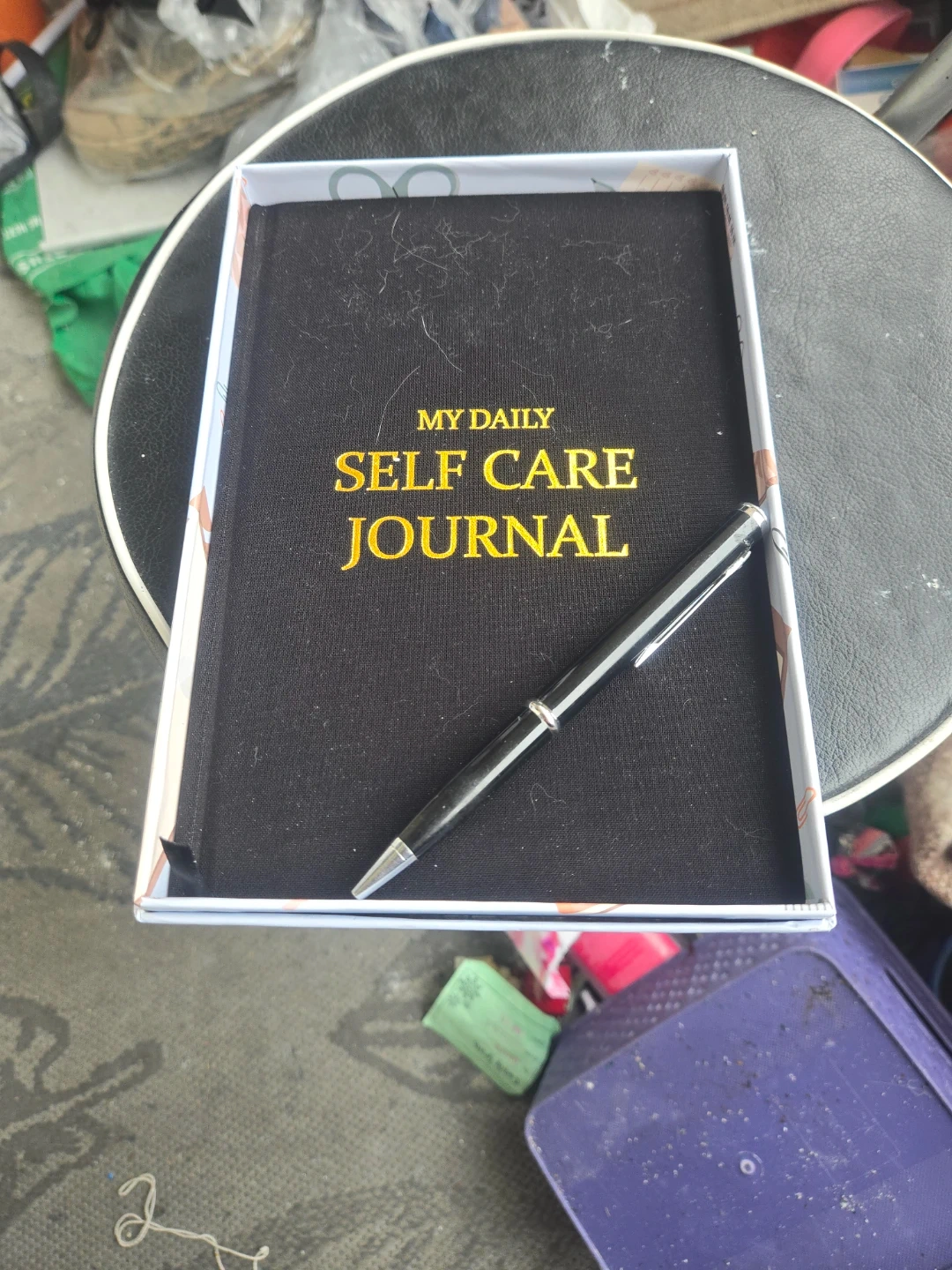 This journal is designed for daily self-care reflection. It includes a black journal with a gold foil title and a black ballpoint pen. The cover features a charming pattern of stationery items. Pick up only please