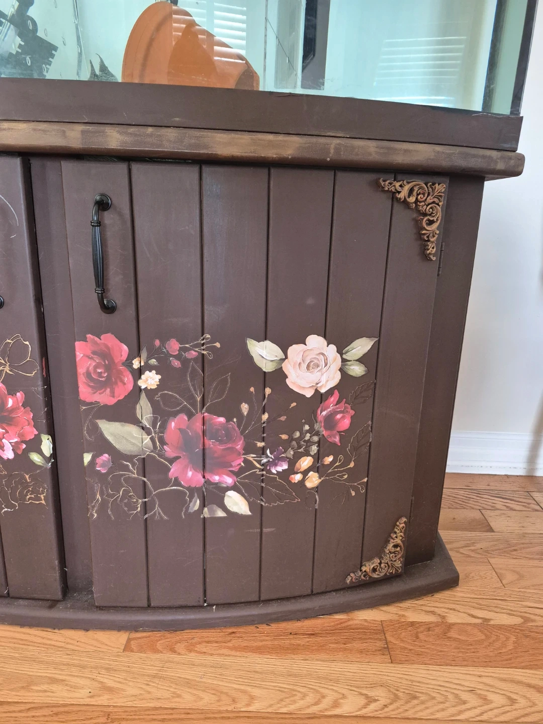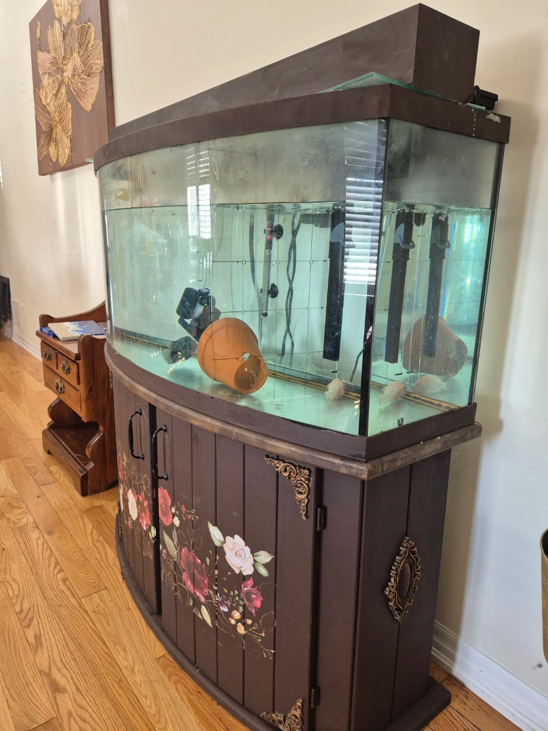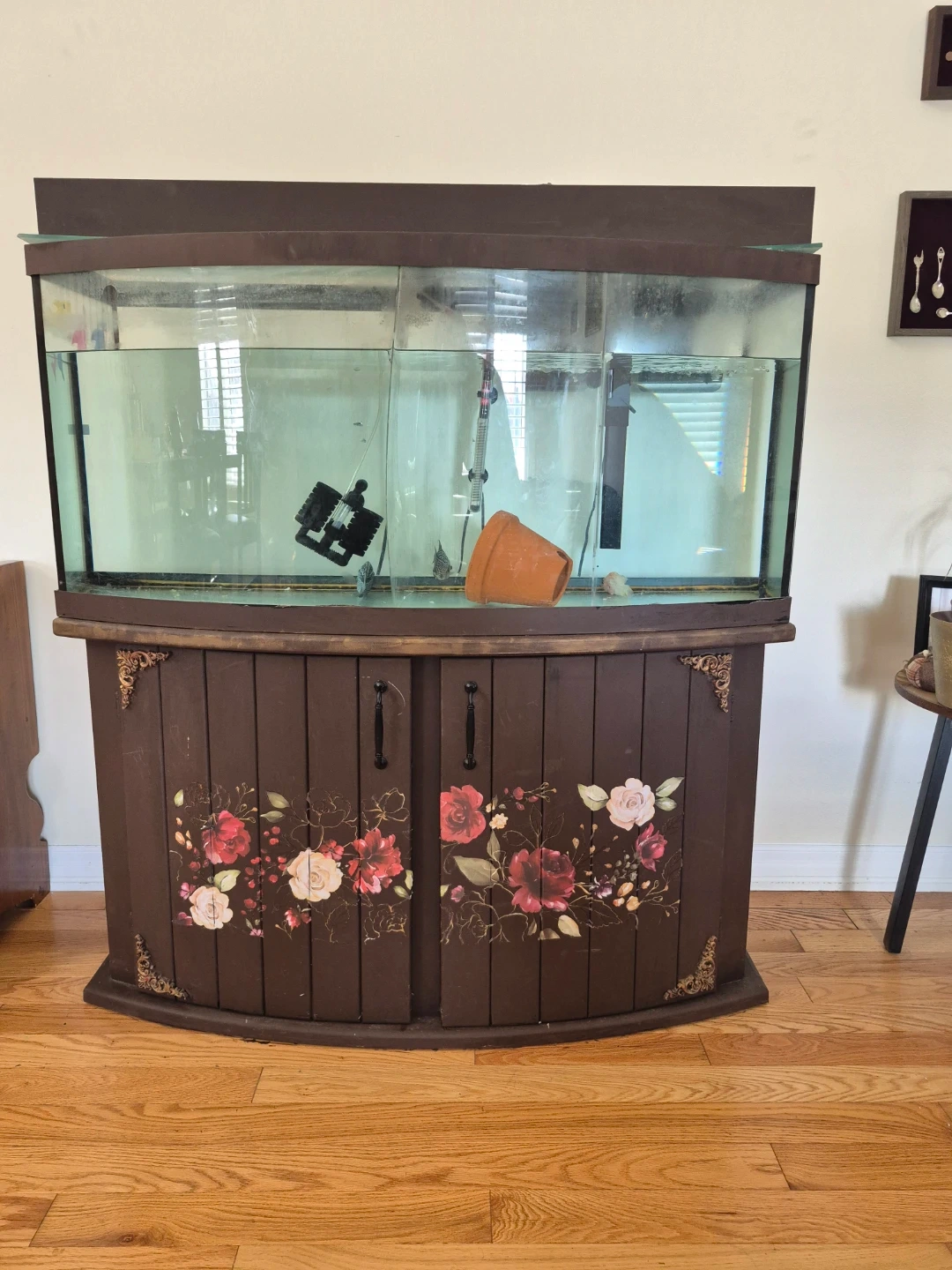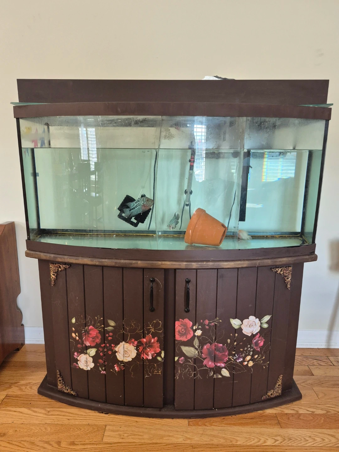 This is a large, curved aquarium tank set atop a dark brown cabinet stand. The stand features decorative floral decals and ornate corner accents. It includes the tank, stand, and visible aquarium equipment. Great for housing fish and creating a beautiful aquatic display!