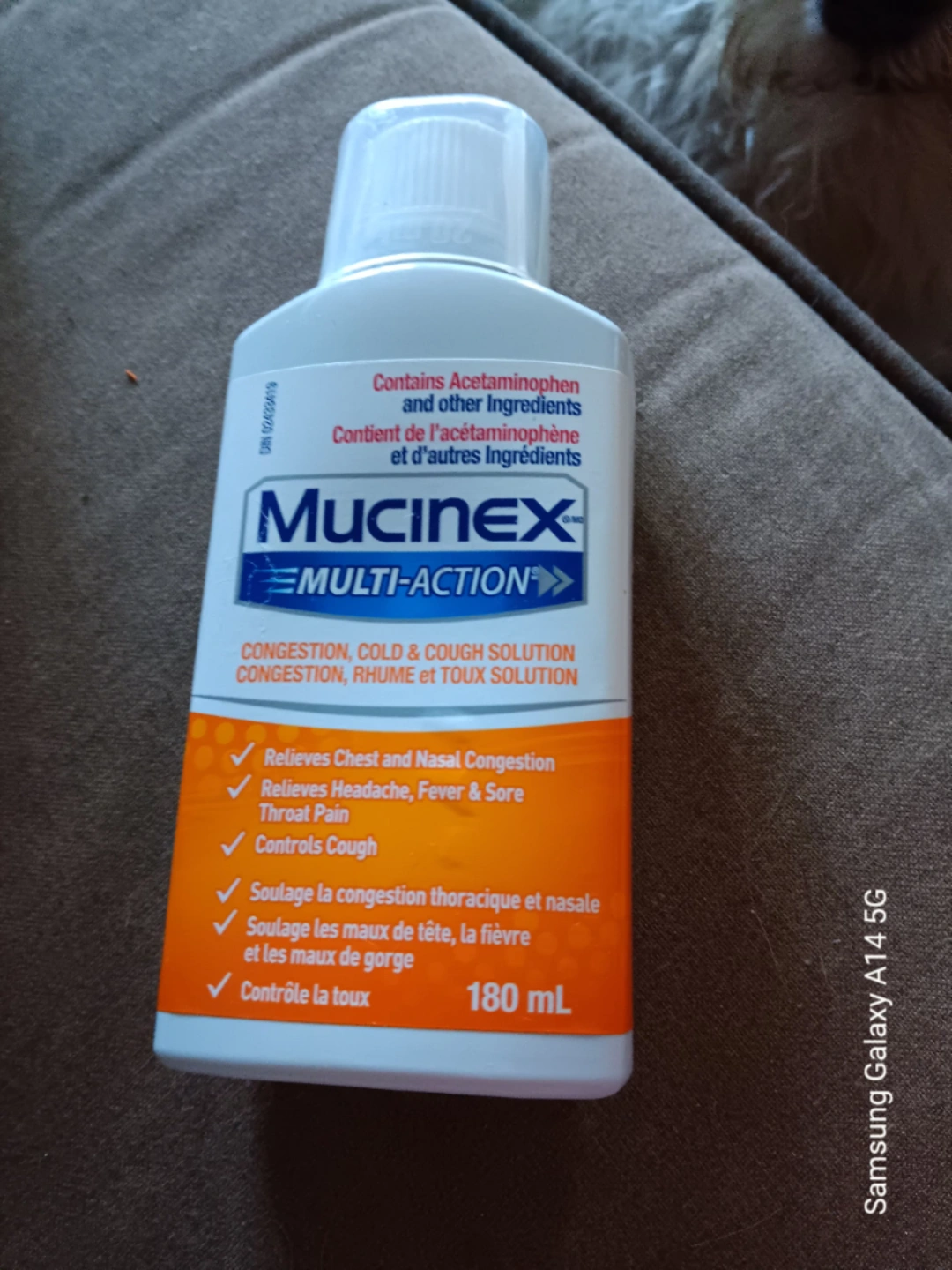 1000+Selling a bottle of Mucinex Multi-Action congestion, cold & cough solution. It helps relieve chest and nasal congestion, headache, fever, and sore throat pain. Also controls cough! Volume: 180 mL 647-203-0411