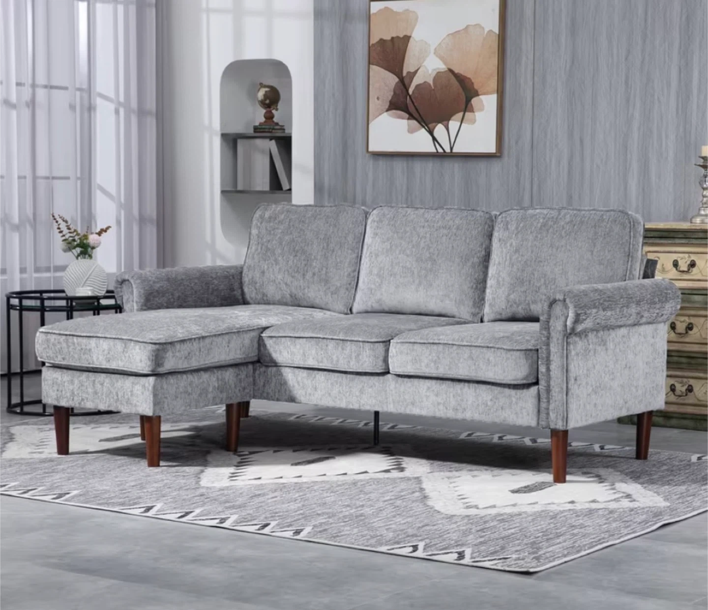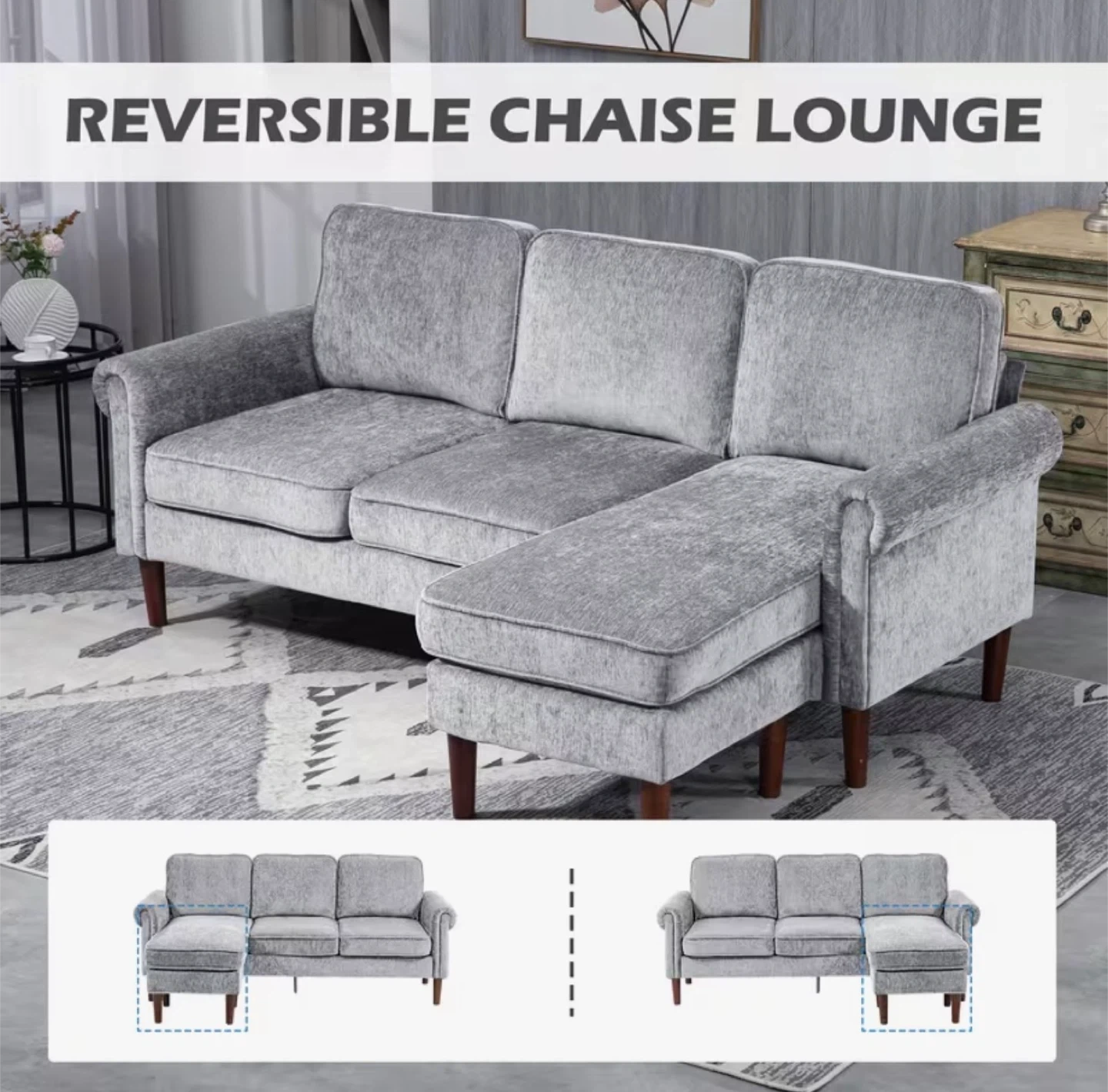 This reversible chaise lounge sofa features soft chenille-feel fabric and overstuffed back cushions. It has rolled armrests and thick padded seat cushions. The chaise can be configured on either the left or right side. Overall dimensions are 80.3" wide and 55.1" deep.
