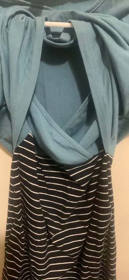 Shein Maternity & Nursing Blue & Striped Dress. It has a convenient teal top and black and white striped bottom! It's a size Medium and in great condition.