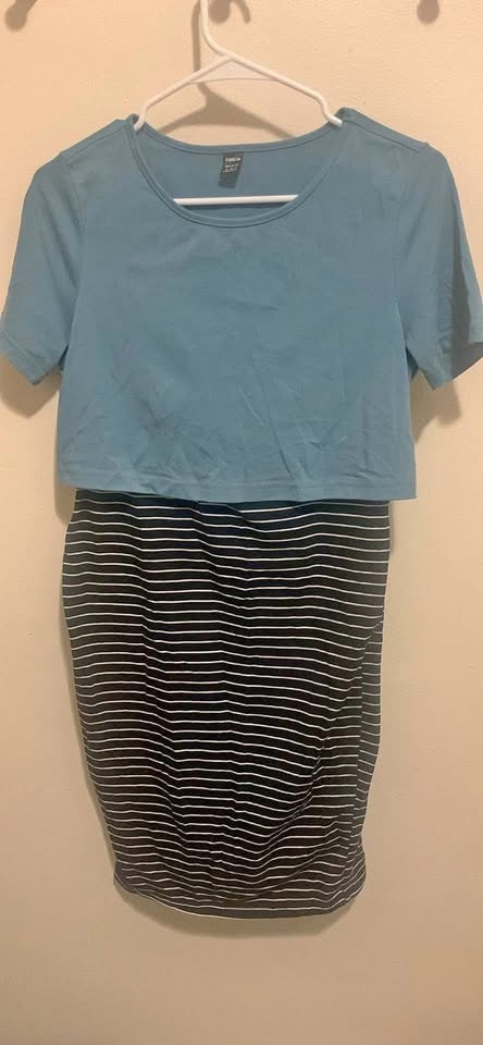 Shein Maternity & Nursing Blue & Striped Dress. It has a convenient teal top and black and white striped bottom! It's a size Medium and in great condition.