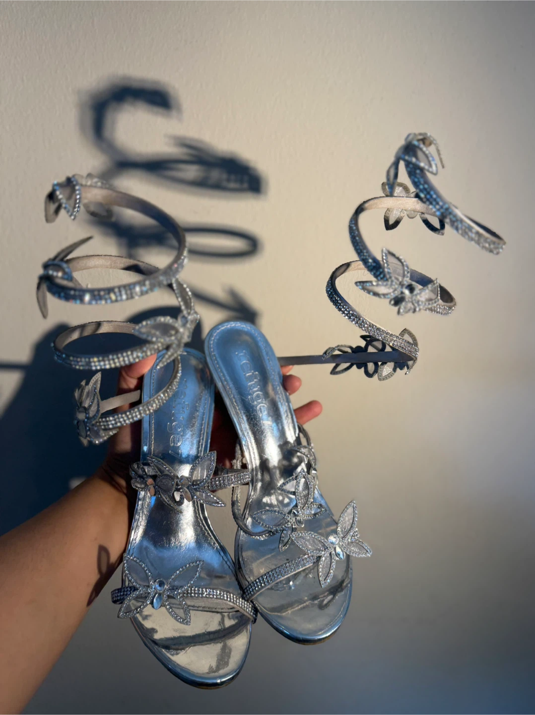 Gorgeous Refige silver heels with a unique spiral design and butterfly details! They're in great condition and ready for a night out. Size 7.