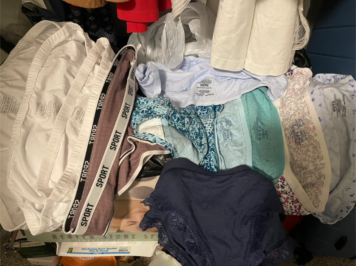 10 pcs. This lot includes assorted women's underwear. You'll find pieces from George and Hanes, in various colours and patterns like white, blue floral, and teal. Some items feature a "SPORT" elastic waistband. Many are size M/ L XL/TG.