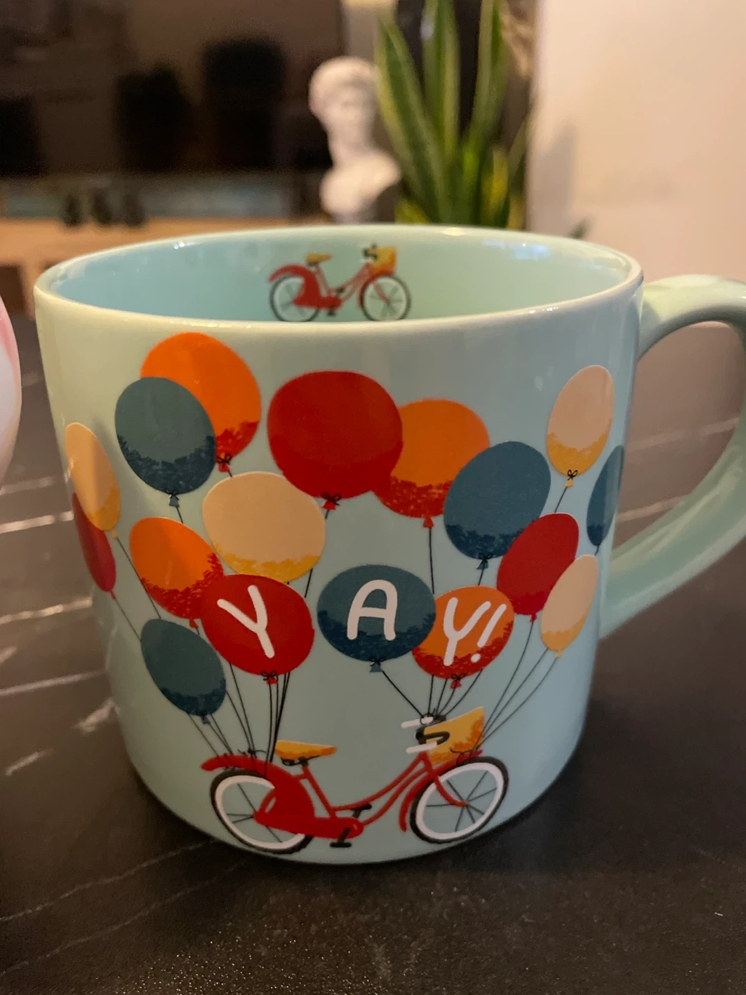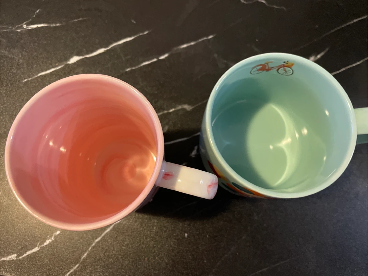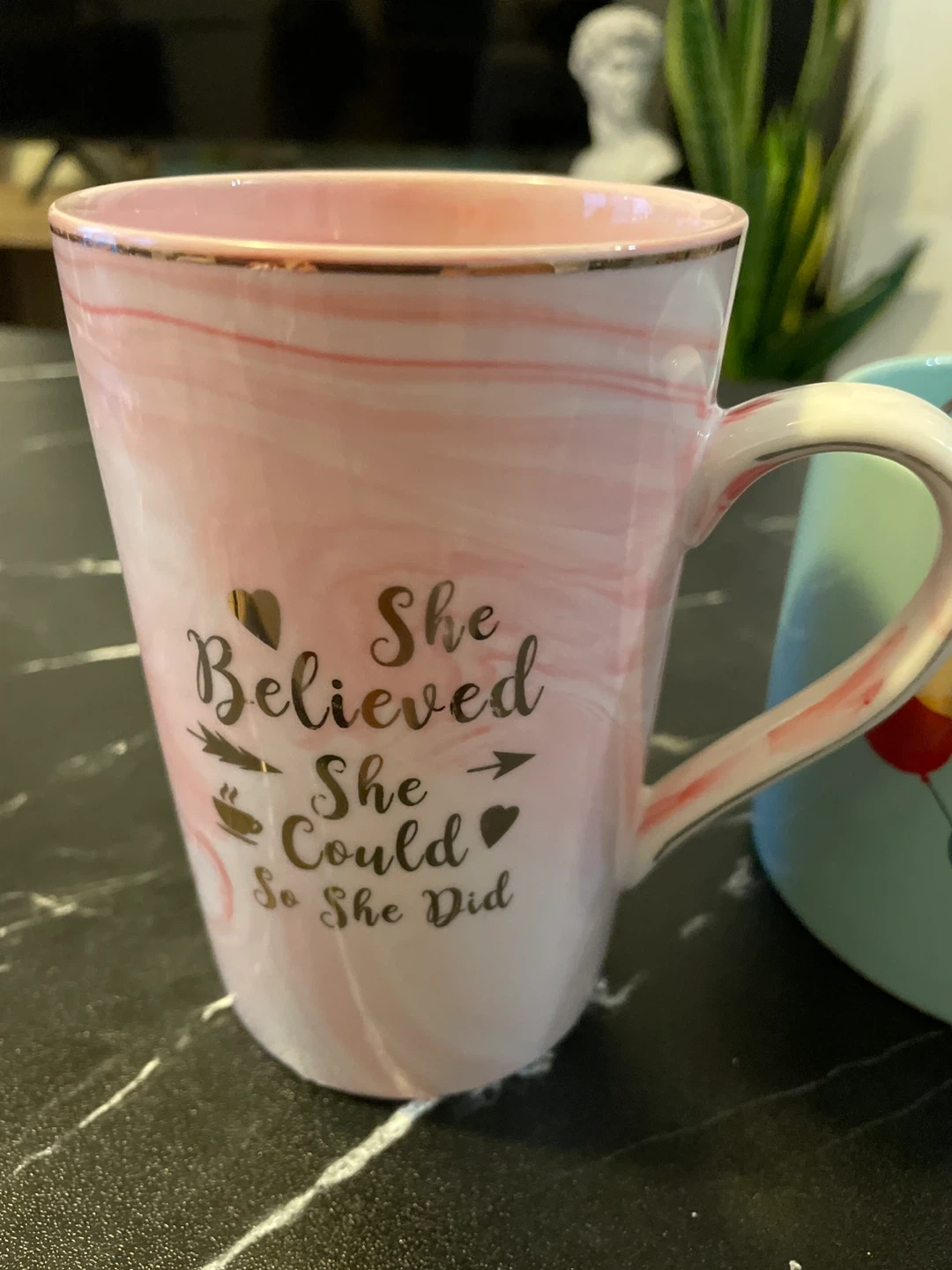 Selling a set of two mugs. One is pink with the saying "She Believed She Could So She Did" and the other is light blue with a bicycle and balloon design. Both are in great condition and are dishwasher and microwave-safe. I didn't use any of it!
