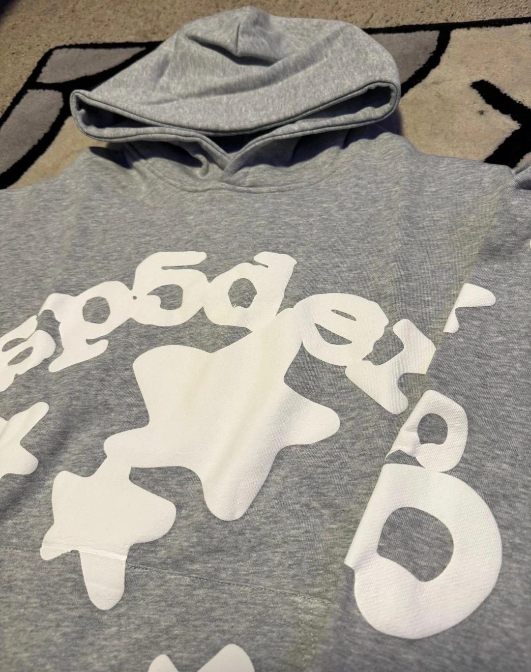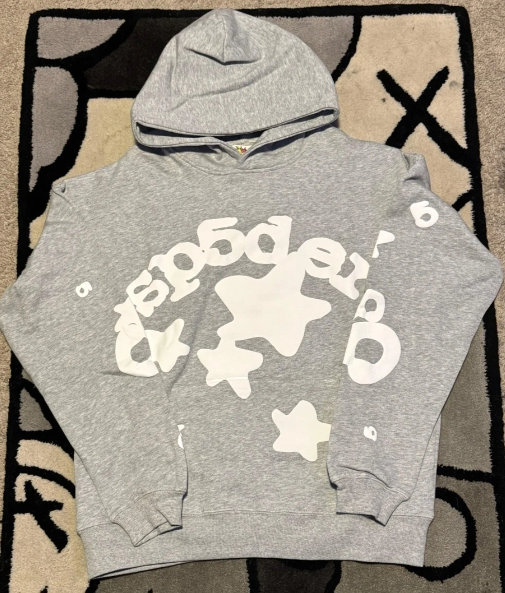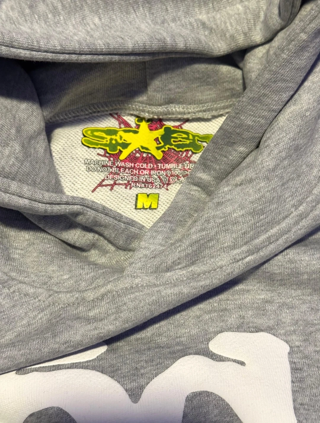 SP5DER Worldwide hoodie. This is a size Large. It's made of 100% cotton. Comes in black and grey options.