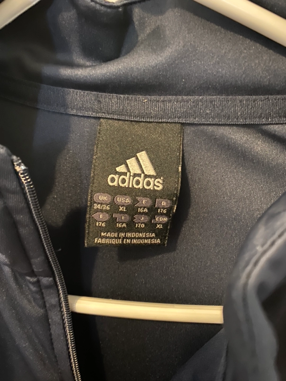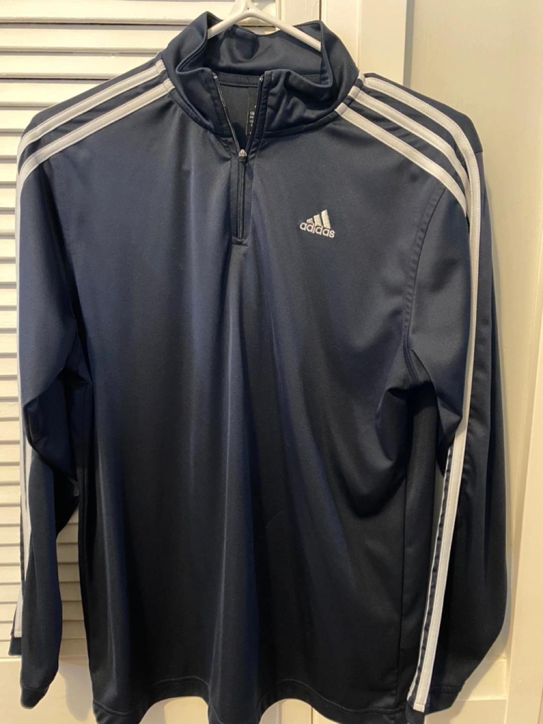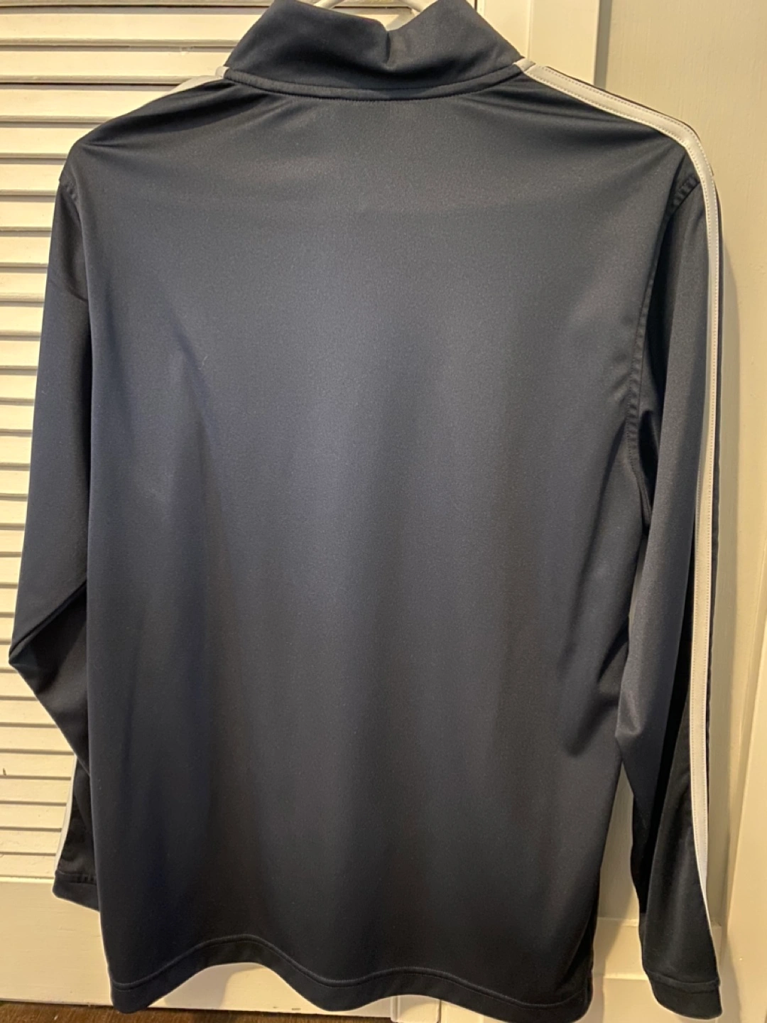 Size youth XL. Dark navy blue with white stripes. Long sleeves. 1/4 zip closure. Made in Indonesia.