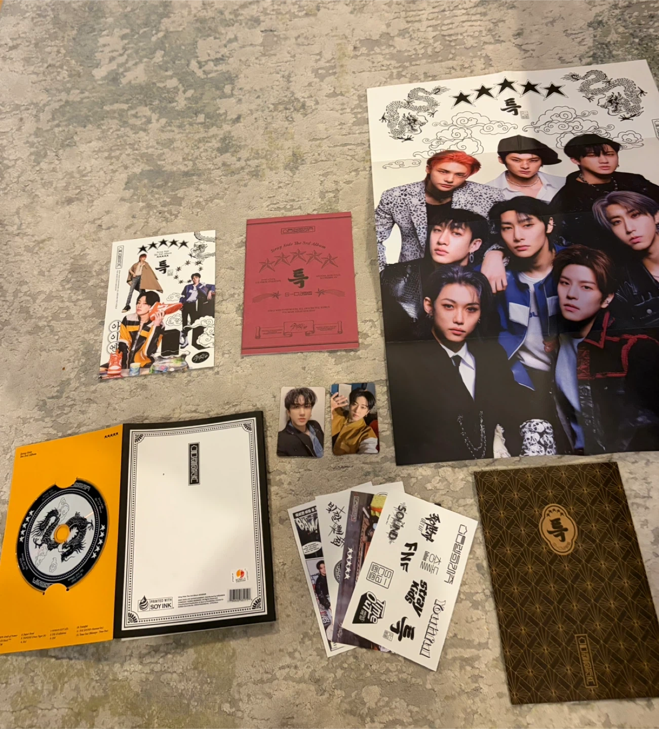 This is a collection of photocards and other inclusions from Stray Kids' 3rd Album, S-CLASS. Includes photocards, posters, stickers, and more.