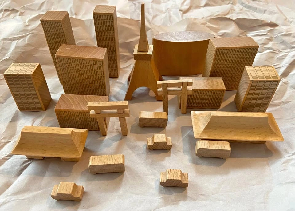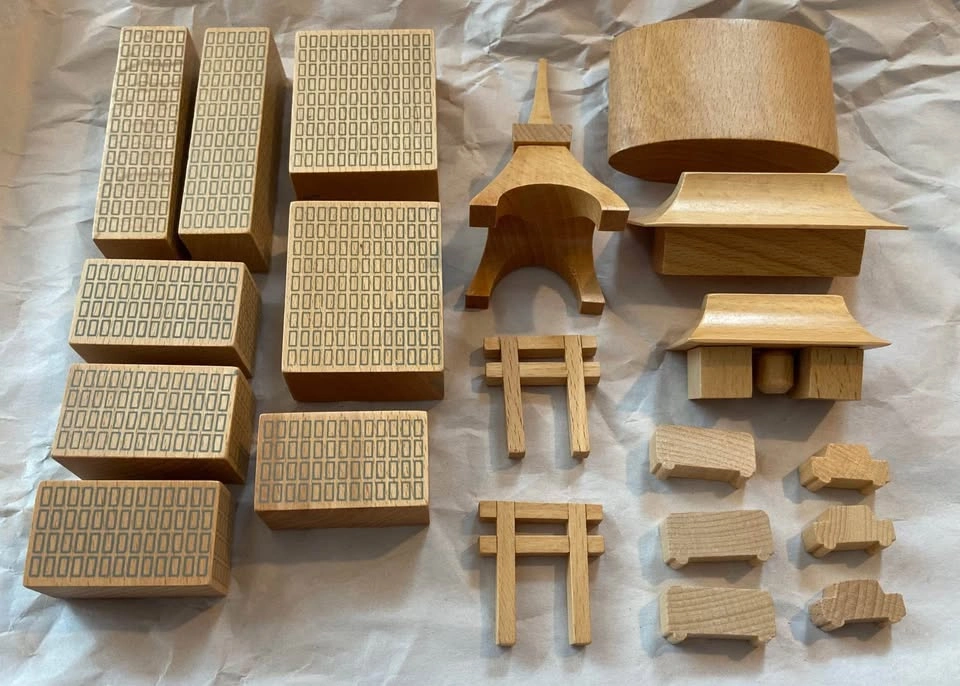 1020 piece Tokyo wooden block set. From Muji’s 2016 “City in a bag” holiday collection (does not come with original bag). No longer available in stores. Stylish and collectible. Perfect for anyone who is interested in world cities, wants to pretend to be godzilla, or just likes blocks. Varnished wooden pieces include skyscrapers, iconic buildings and structures, plus cars and buses. Tallest buildings are 11 cm tall, the cars are 1.25 cm tall. Open to reasonable offers.