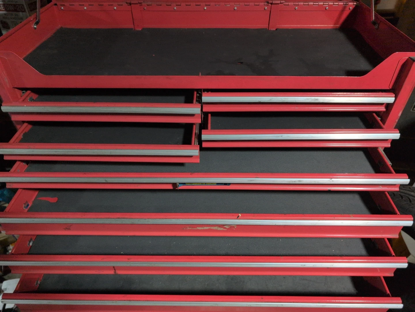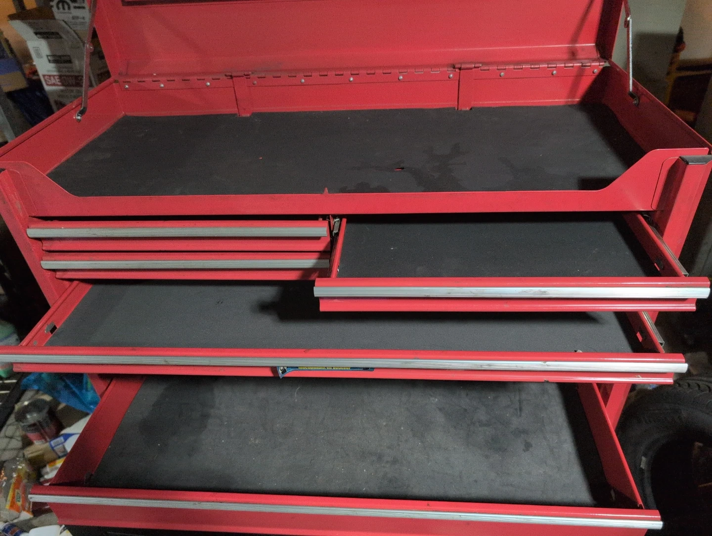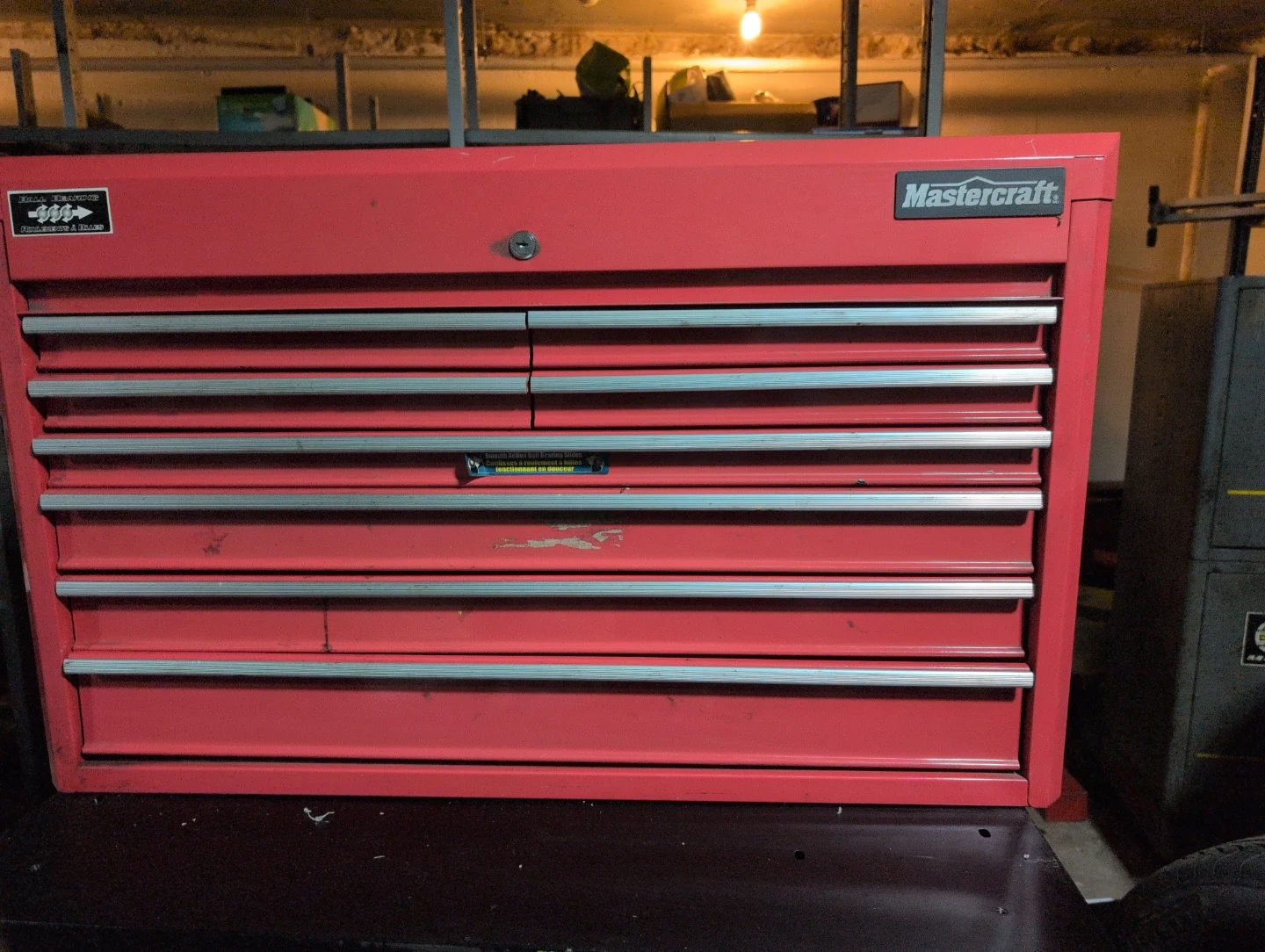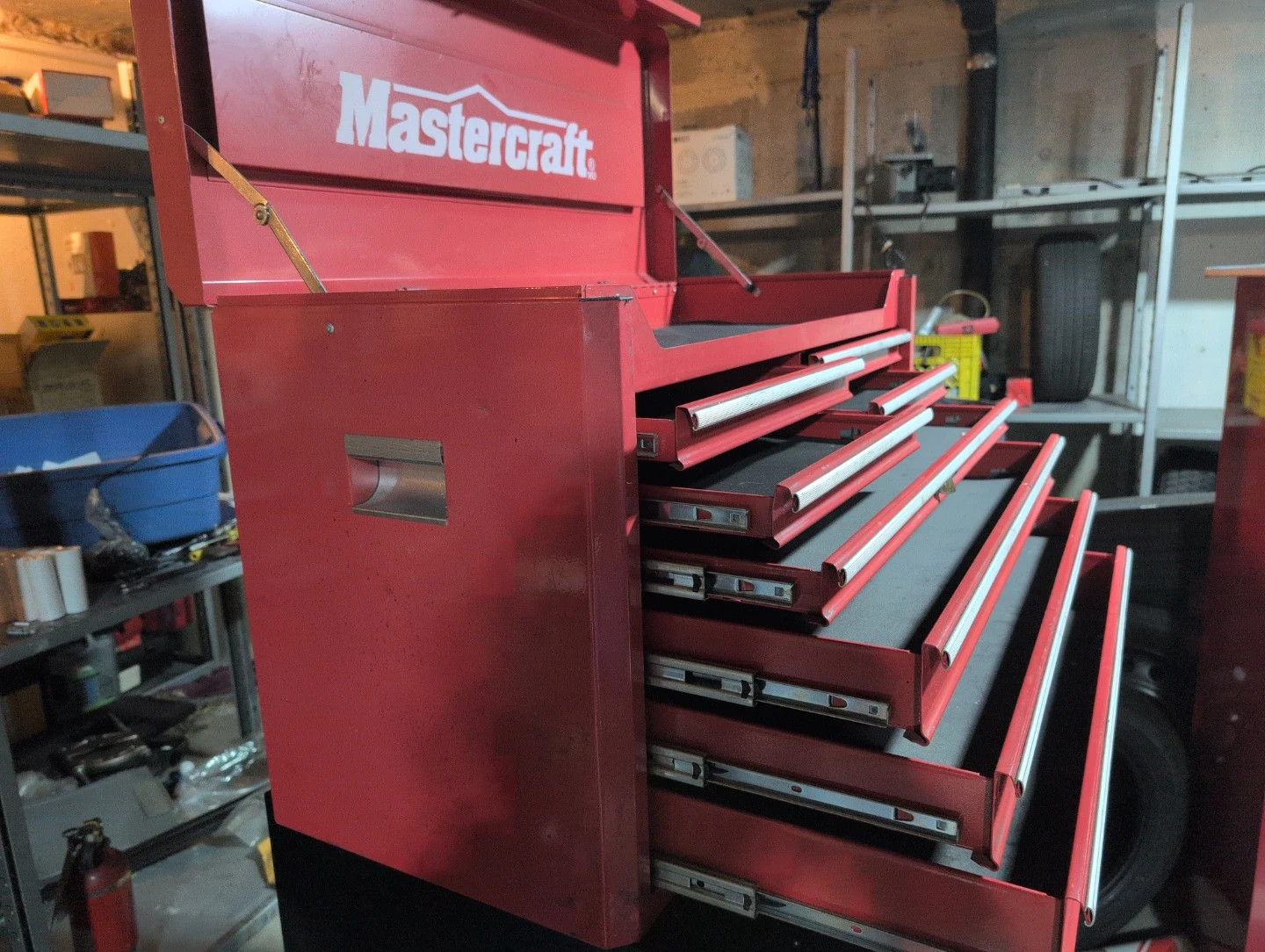 This is a Mastercraft red rolling tool chest with multiple drawers. It's made of metal and comes with drawer liners. Keep your tools organized and accessible!