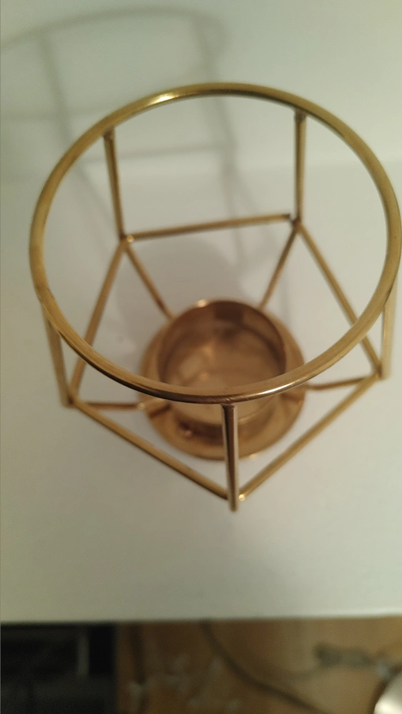 This gold wire candle holder has a modern geometric design. It's made of metal wire with a brass finish. A great piece for adding a little sparkle to any room!