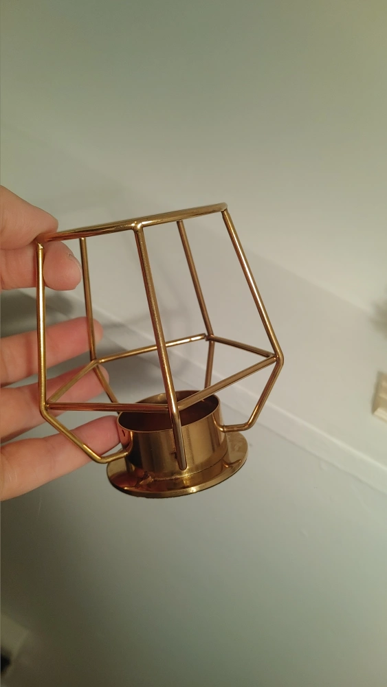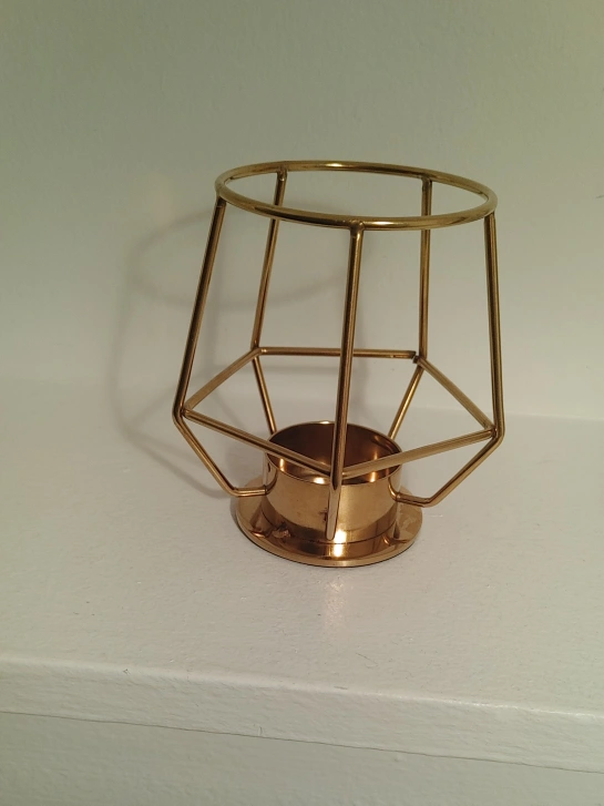 This gold wire candle holder has a modern geometric design. It's made of metal wire with a brass finish. A great piece for adding a little sparkle to any room!