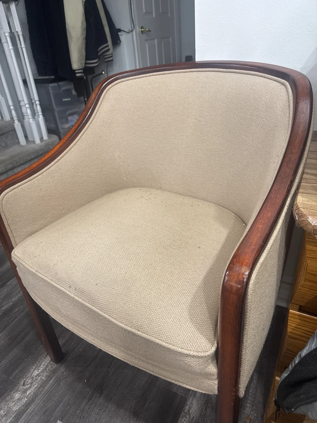 Selling a comfy upholstered accent chairs! It features a neutral beige fabric and a dark wood frame. It's in good condition and would be a great addition to any living room or bedroom