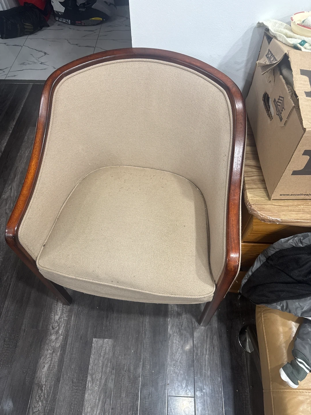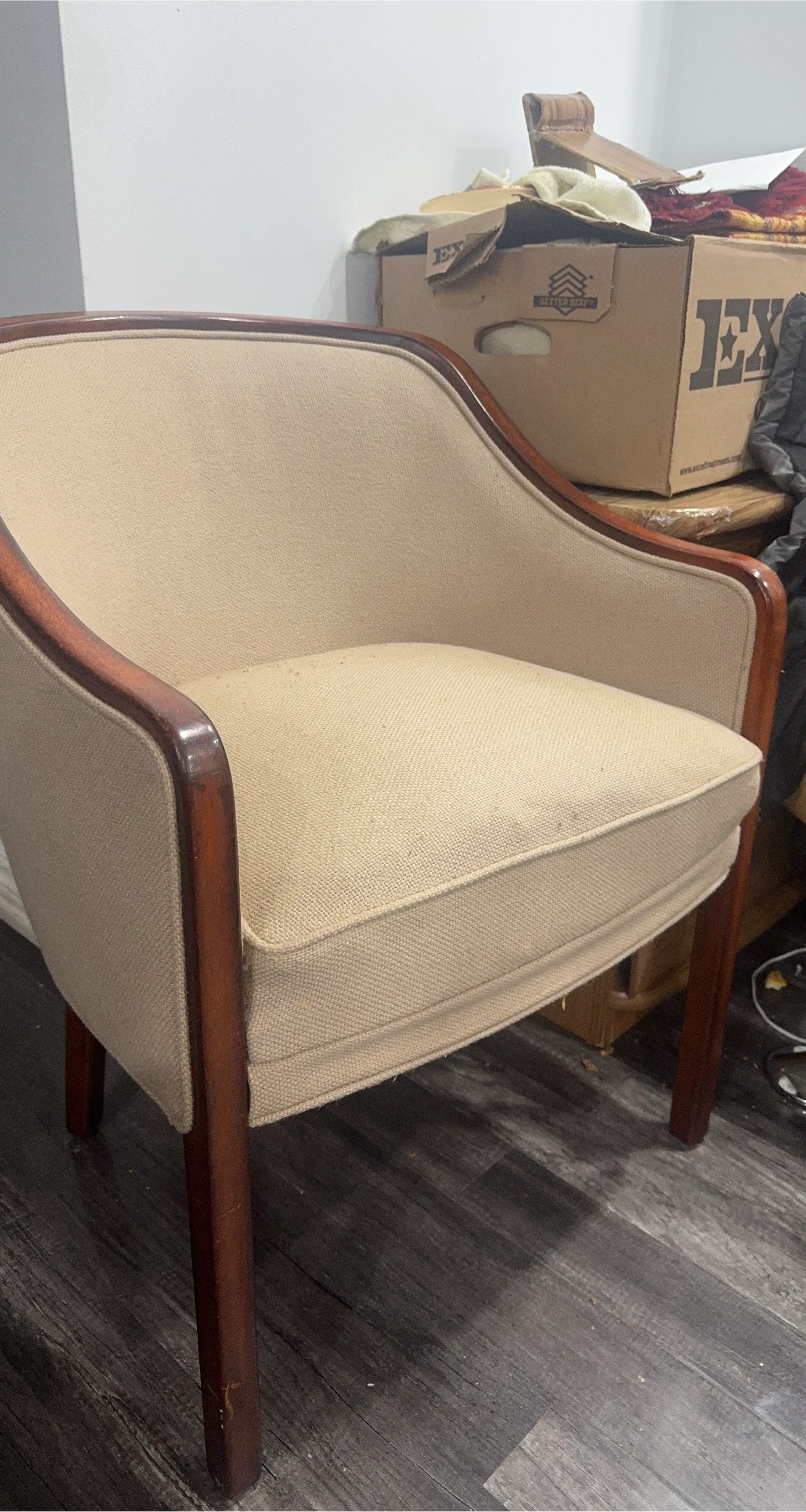 Selling a comfy upholstered accent chairs! It features a neutral beige fabric and a dark wood frame. It's in good condition and would be a great addition to any living room or bedroom