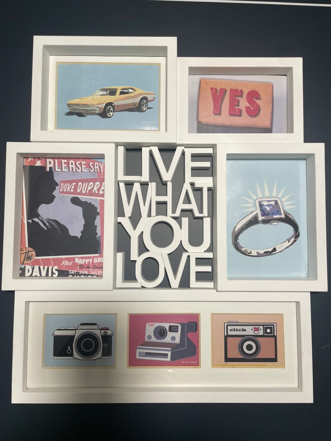 10Selling a multi-picture frame. It has spaces for several different photos or art pieces. The frame is white and in great condition. It includes spaces for pictures of various sizes, including square and rectangular formats. Perfect for displaying your favourite memories or adding a decorative touch to your home!