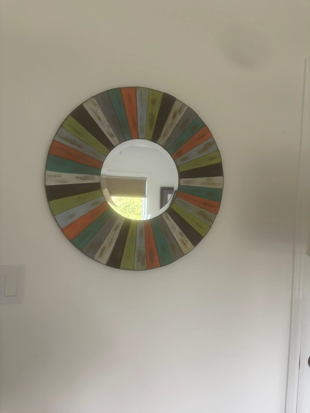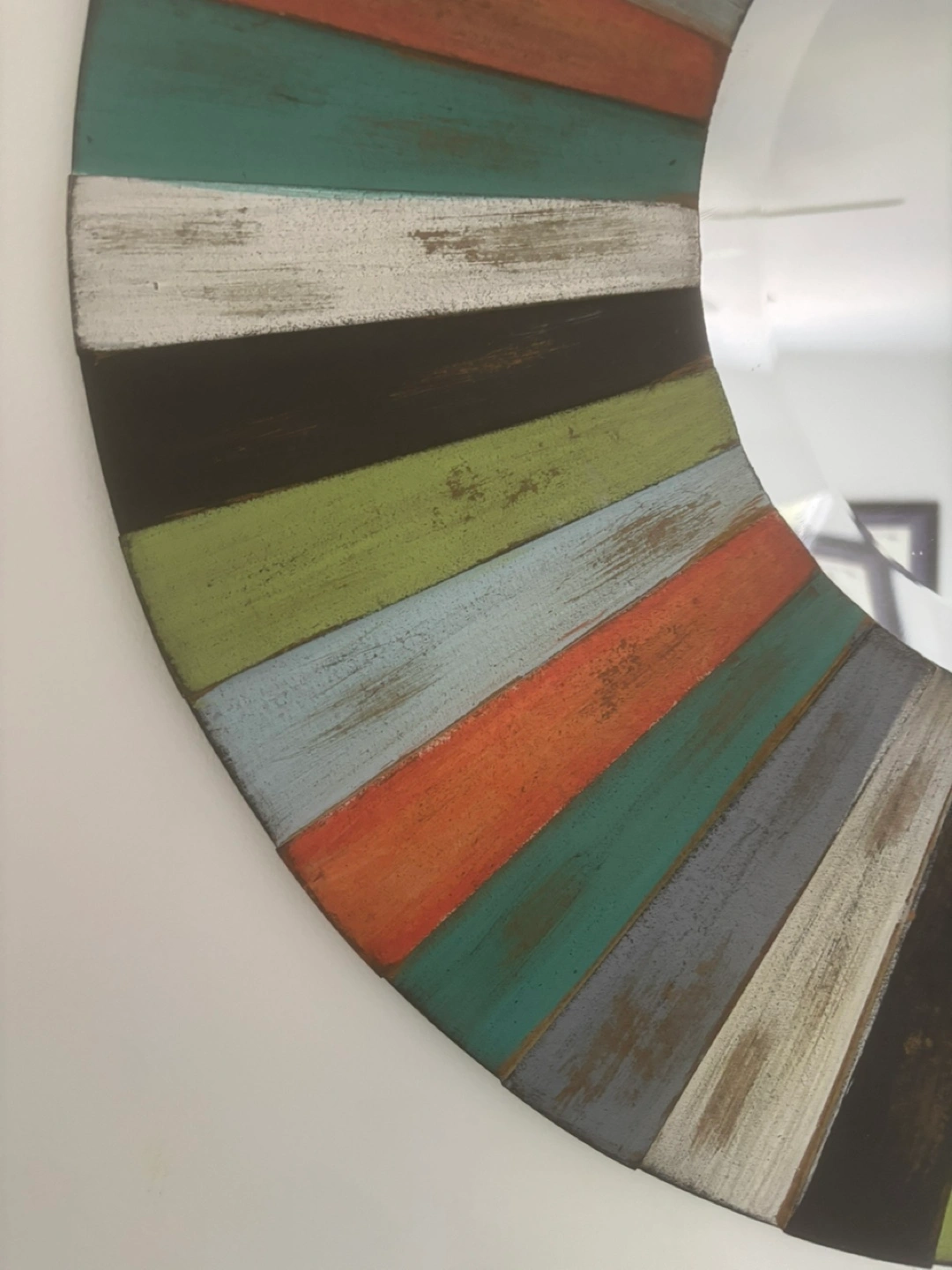 Beautiful round mirror. Multicoloured wooden frame. Adds a pop of colour to any room. Great for hallways or bedrooms. 23” diameter. Mirror 10” diameter.