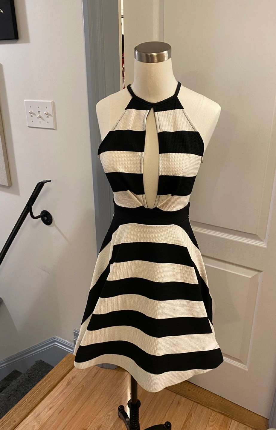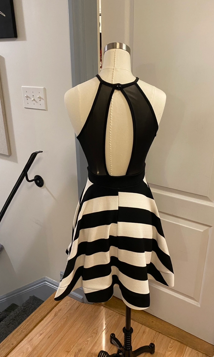 Brand new and never worn. Black and white striped dress with a cutout in the front and a mesh panel in the back. Halter neck. A-line skirt.