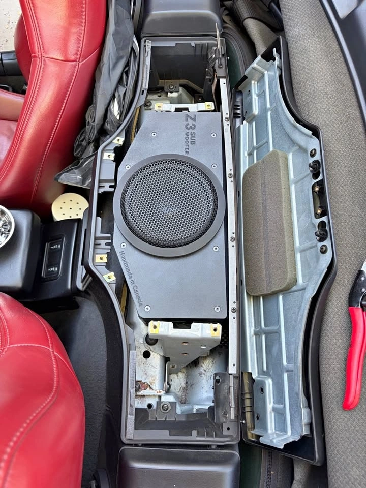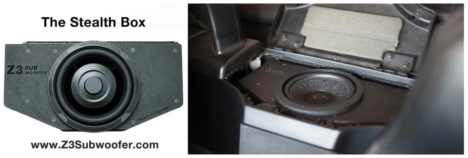 Handmade subwoofer enclosure for the BMW Z3. Available packages: Stealth Box + SWS Package - ($719), Stealth Box + Helix Package - ($959), Big Box + Helix Package - ($1239), Big Box + JL Audio Package - ($1449). Prices in CAD, plus applicable taxes.