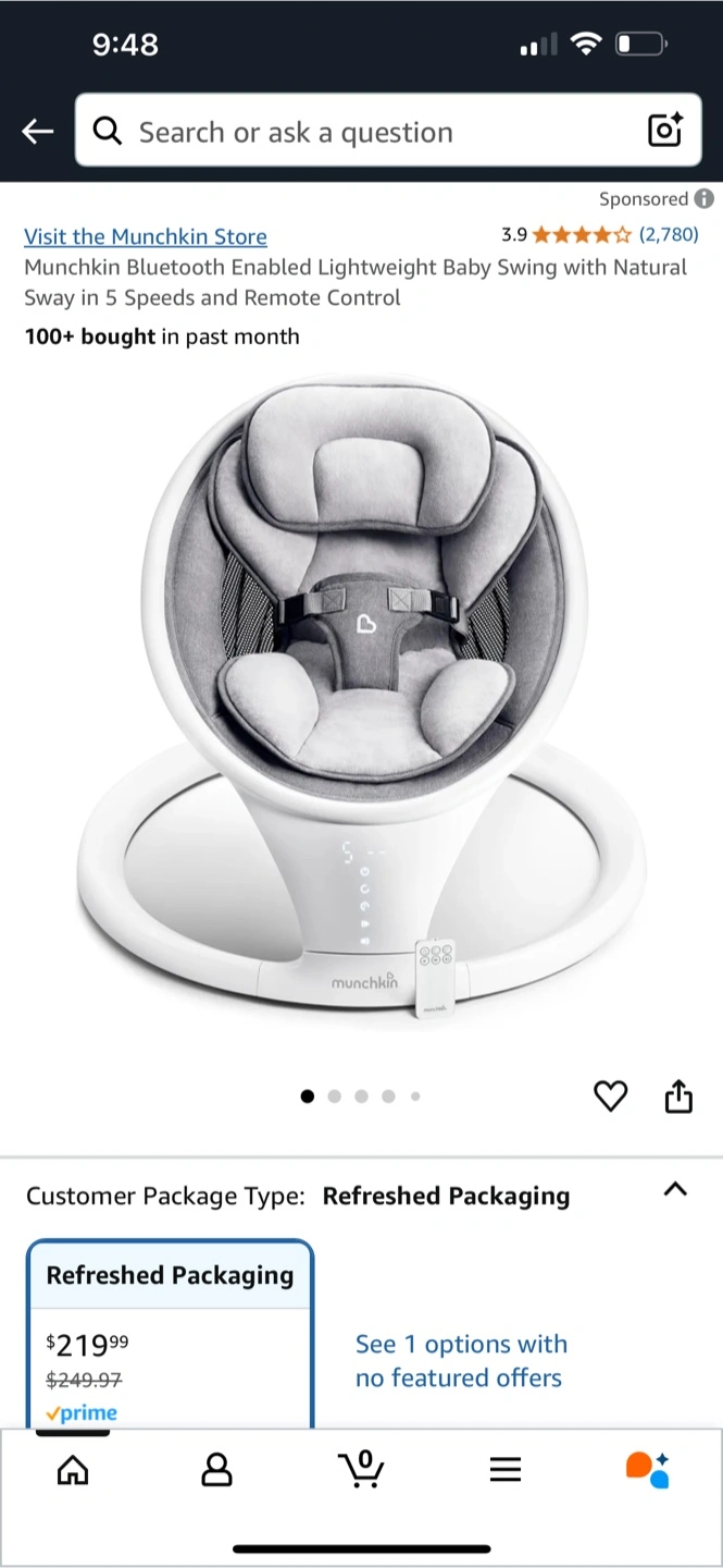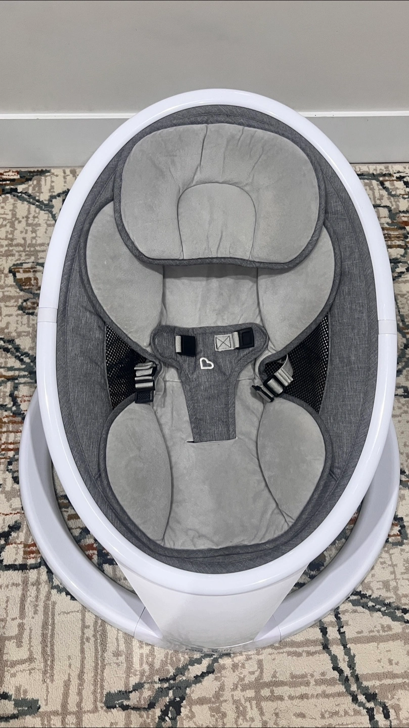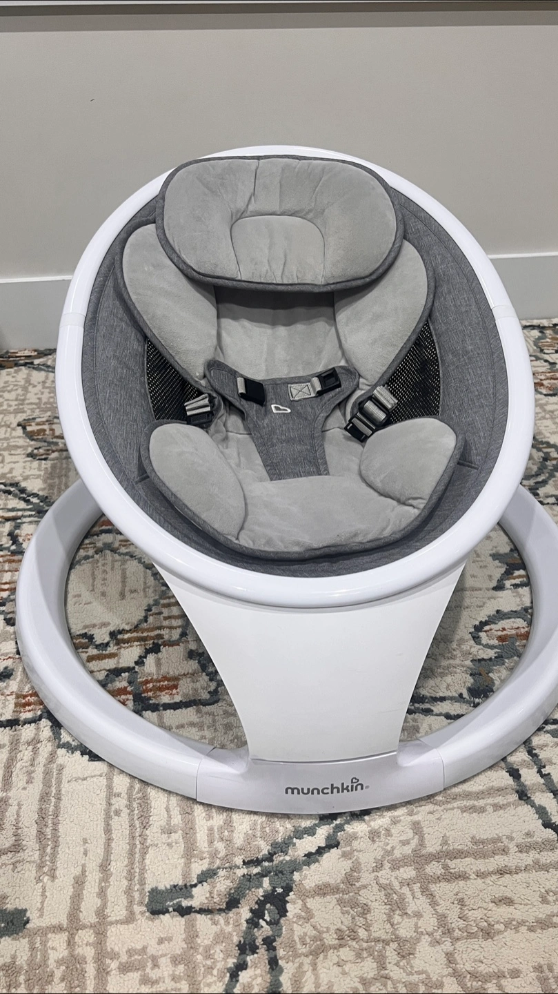 A baby swing in a neutral colour scheme. The swing has a circular design with soft padding for comfort. It rests on a rounded base, with a control panel. The perfect place for a little one to relax peacefully.