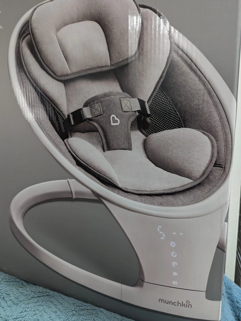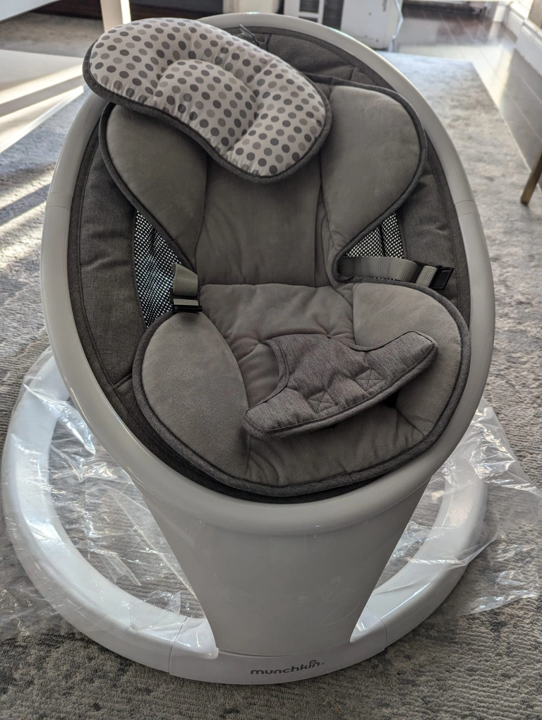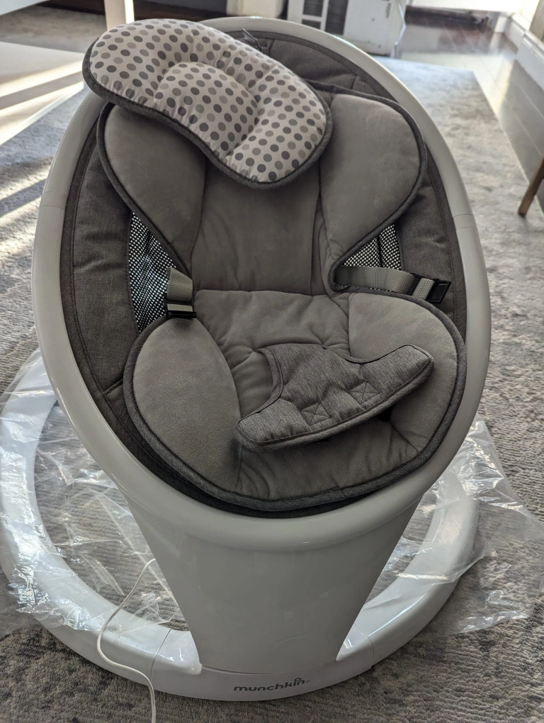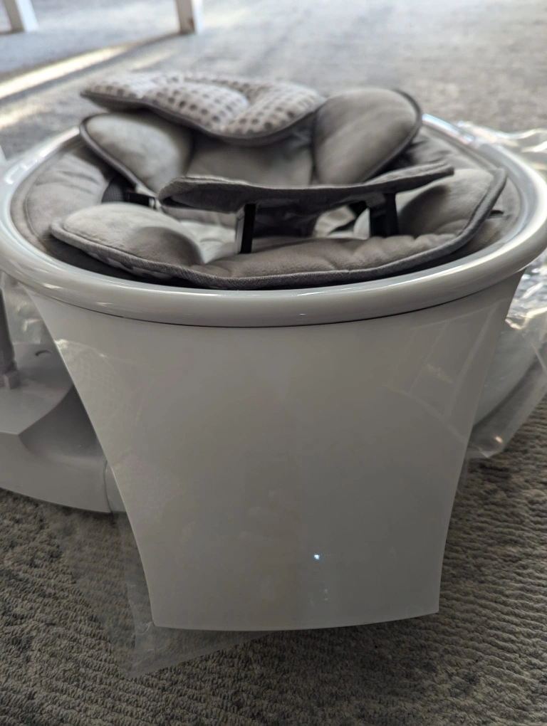 392Baby swing in excellent condition. It is grey and white in colour with a soft grey fabric seat and a white base. Includes a Bluetooth remote to control the swing and play soothing music and nature sounds.