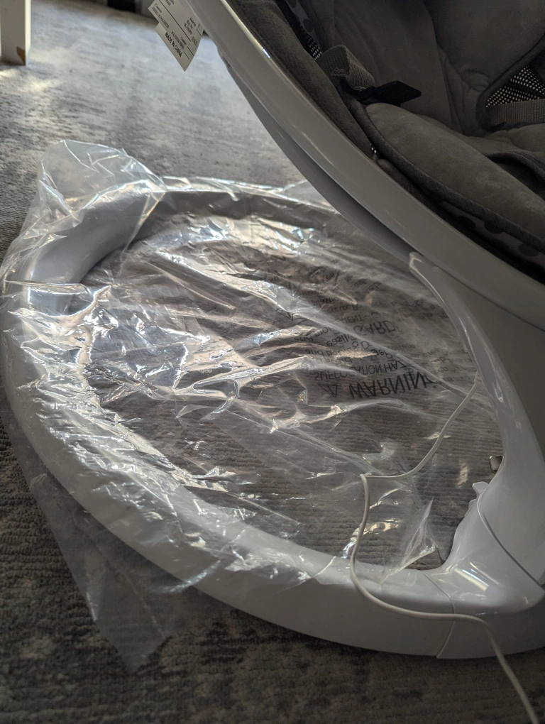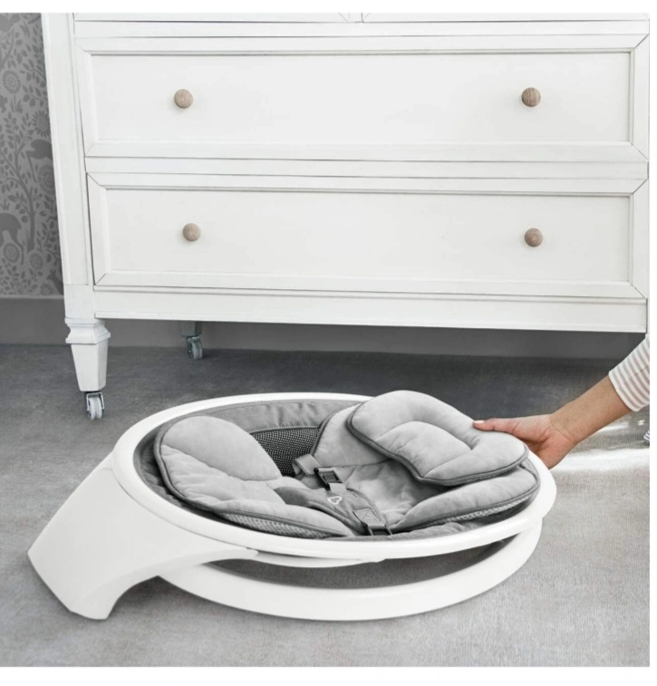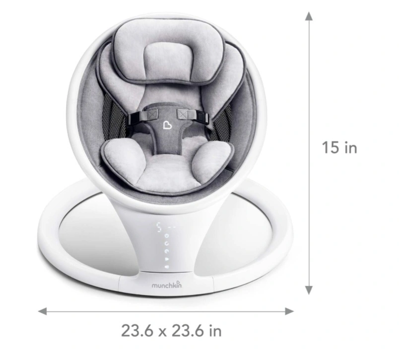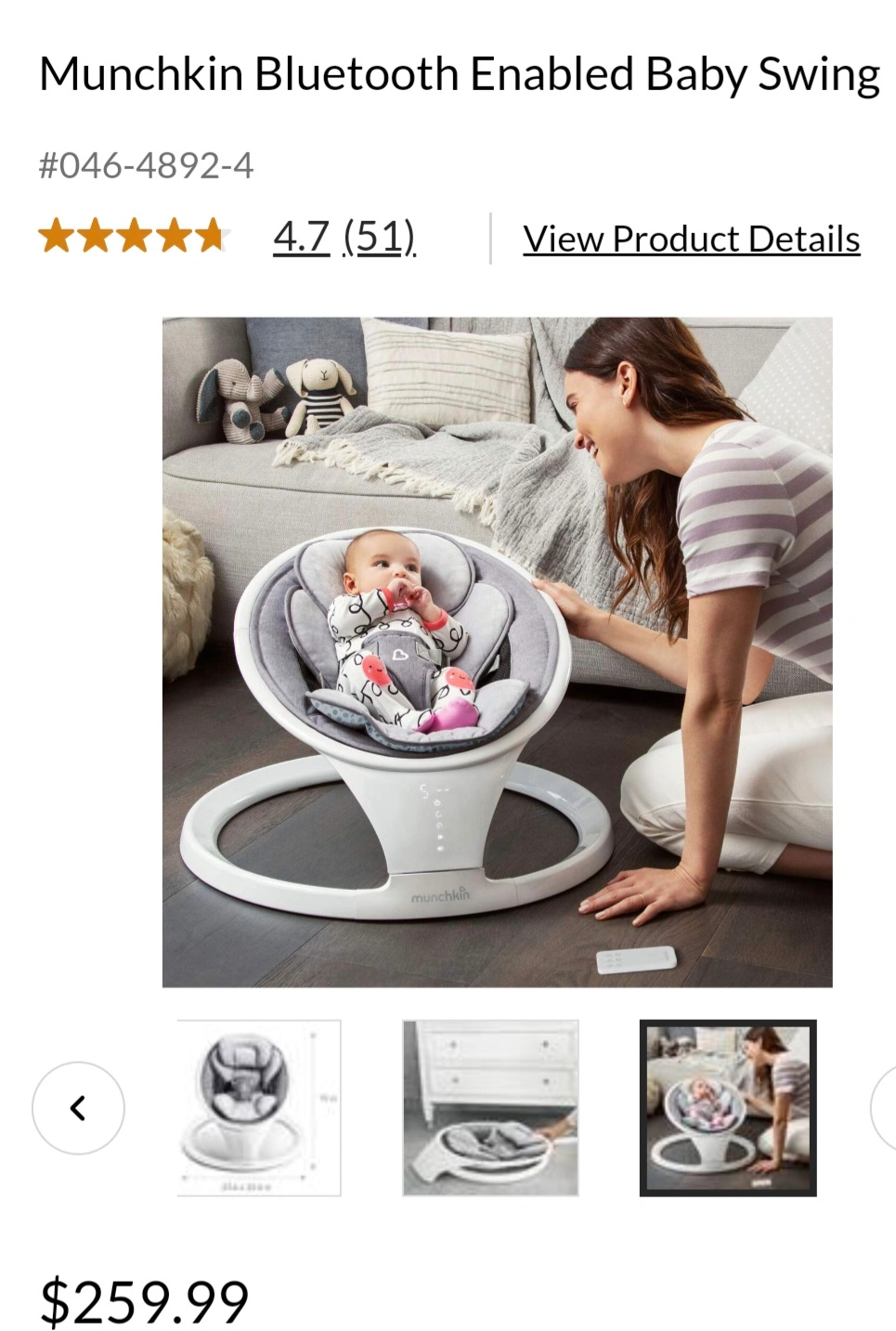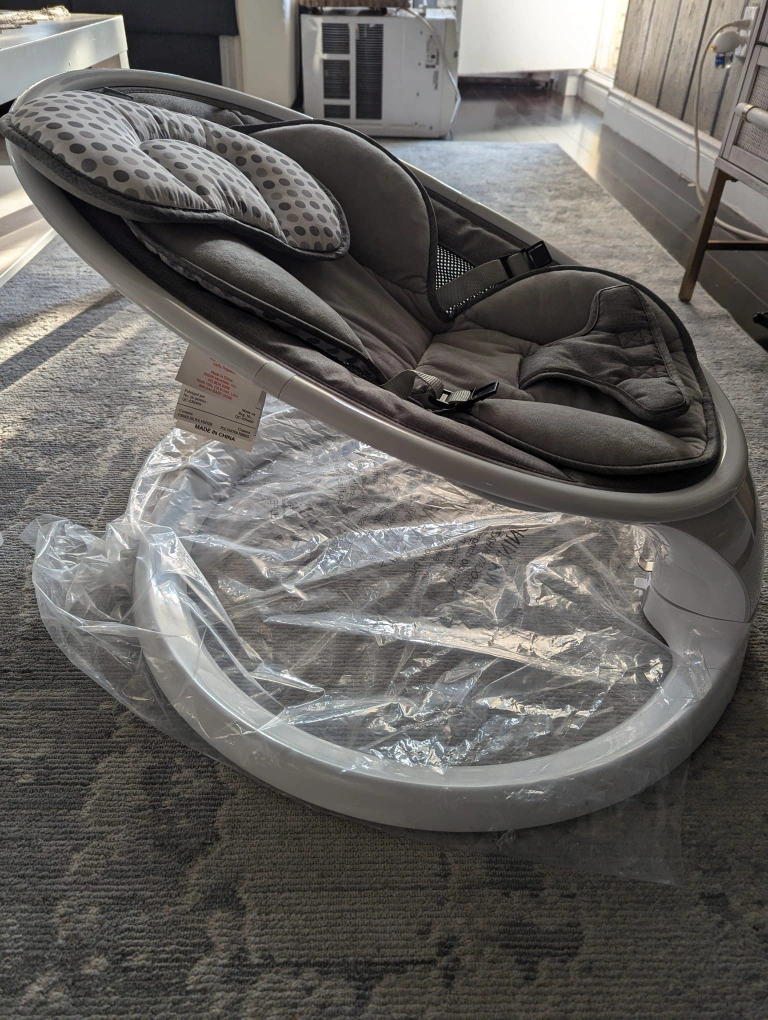 392Baby swing in excellent condition. It is grey and white in colour with a soft grey fabric seat and a white base. Includes a Bluetooth remote to control the swing and play soothing music and nature sounds.